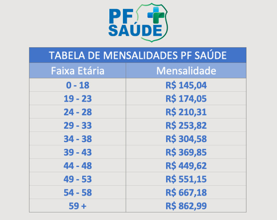 Tabela de mensalidades do PF Saúde