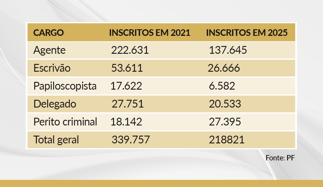 O concurso da Polícia Federal 2025, realizado no último domingo (27), registrou queda significativa no número de inscritos, com apenas 218.821 candidaturas para mil vagas distribuídas entre os cargos de delegado, perito criminal, agente, escrivão e papiloscopista. O número representa uma redução de 35,6% em relação à seleção anterior, realizada em 2021, que teve 339.757 inscrições.