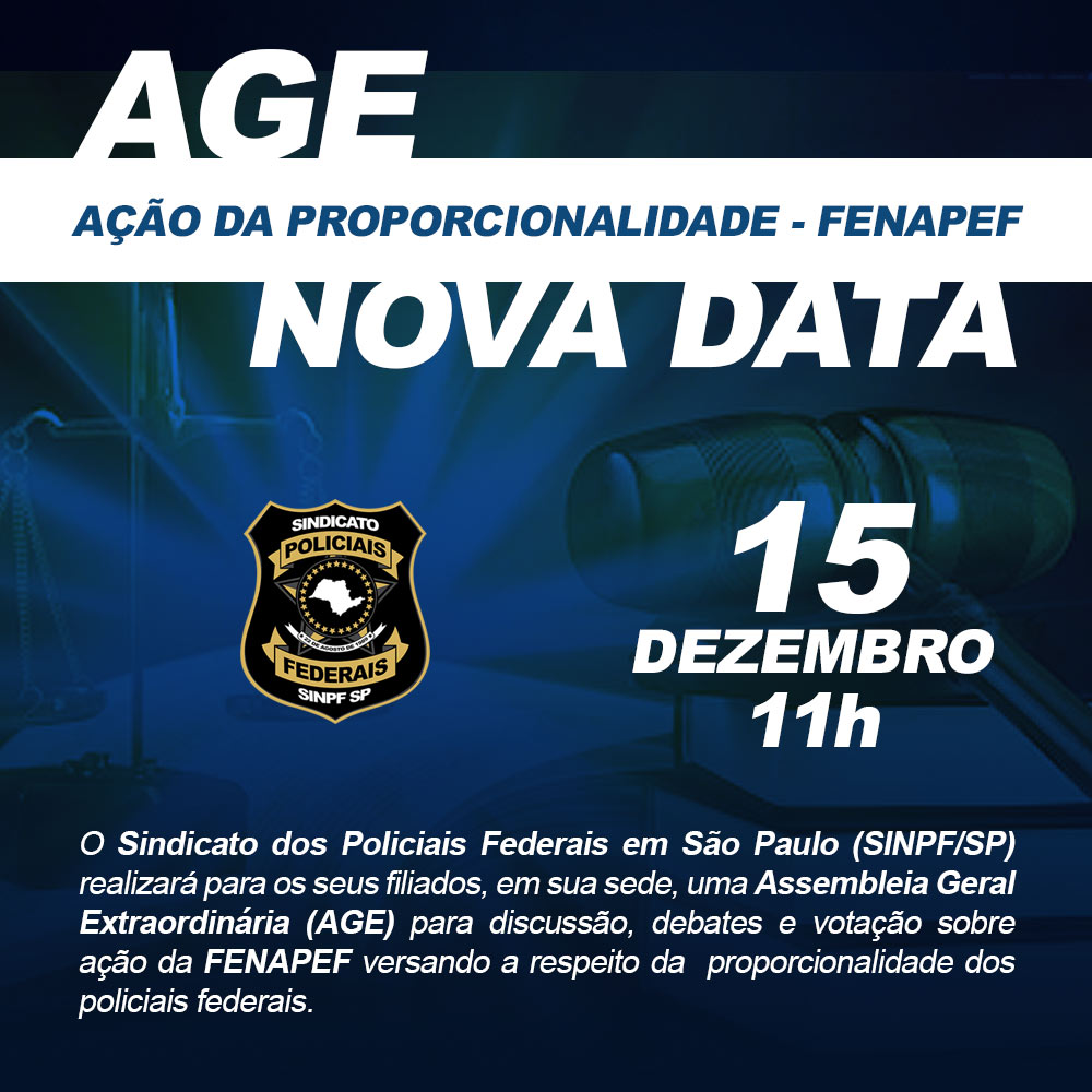 No dia 15 de dezembro de 2021, às 11h00 da manhã, o Sindicato dos Policiais Federais em São Paulo (SINPF/SP) realizará para os seus filiados, em sua sede, uma Assembleia Geral Extraordinária (AGE) para discussão, debates e votação sobre ação da FENAPEF versando a respeito da proporcionalidade dos policiais federais.