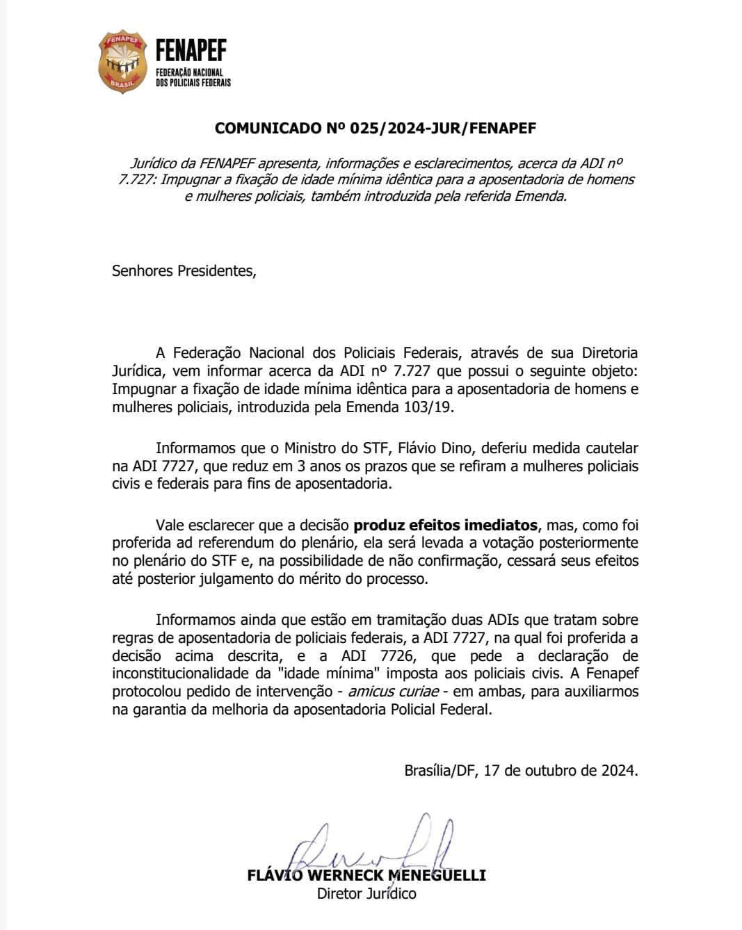 O SINPF/SP divulga comunicado nº 25/2024 – JUR-Fenapef com informações e esclarecimentos sobre a ADI nº 7.727 que possui como objeto: impugnar a fixação de idade mínima idêntica para aposentadoria de homens e mulheres policiais, introduzida pela Emenda 103/19.