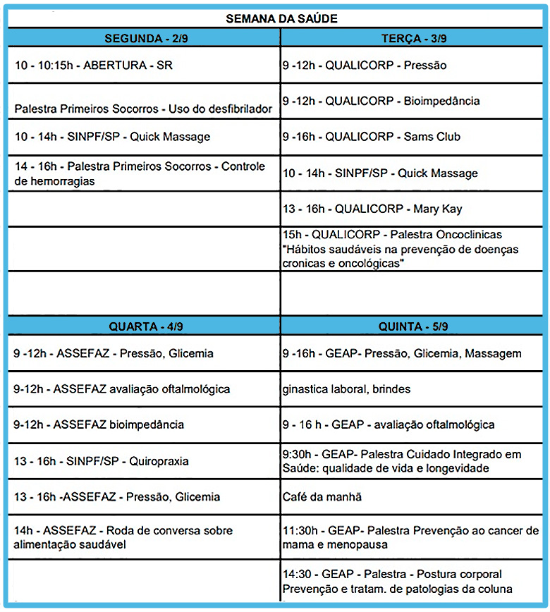 Abertura e Primeiros Socorros: No dia 02 de setembro, às 10h, o Superintendente Rodrigo Luis Sanfurgo de Carvalho dará início ao evento com uma cerimônia de abertura no auditório. Em seguida, uma palestra essencial sobre primeiros socorros e o uso do desfibrilador será apresentada. Além disso, as empresas parceiras do SINPF/SP oferecerão sessões de Quick Massage, proporcionando momentos de relaxamento. O dia se encerrará com mais uma palestra sobre controle de hemorragias.