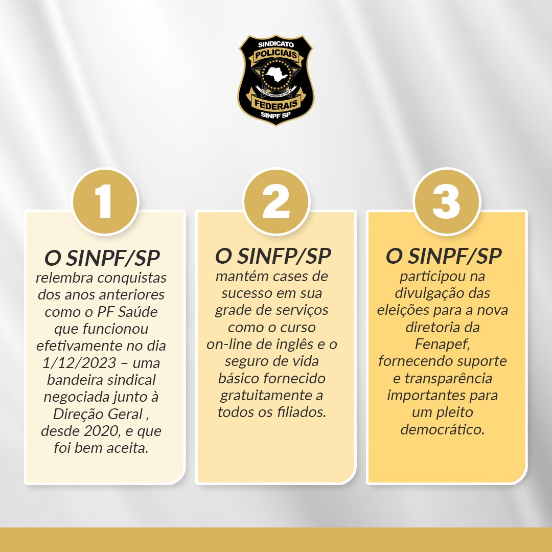 Esperamos muito mais em 2025! O SINPF/SP intensificará novos projetos para fornecer as melhorias necessárias e a valorização do servidor da Polícia Federal. Contamos com todos vocês! Até lá!