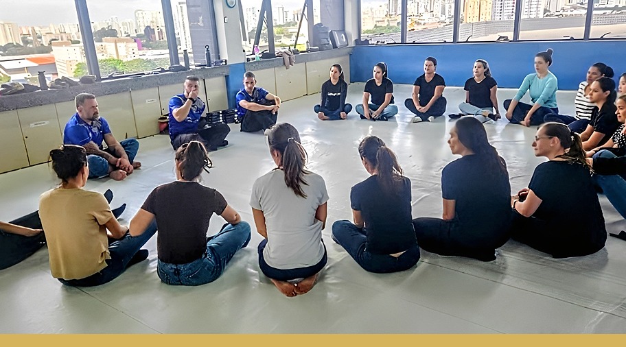 Mulheres policiais participam de treinamento de autodefesa em ação do Agosto Lilás em São Paulo