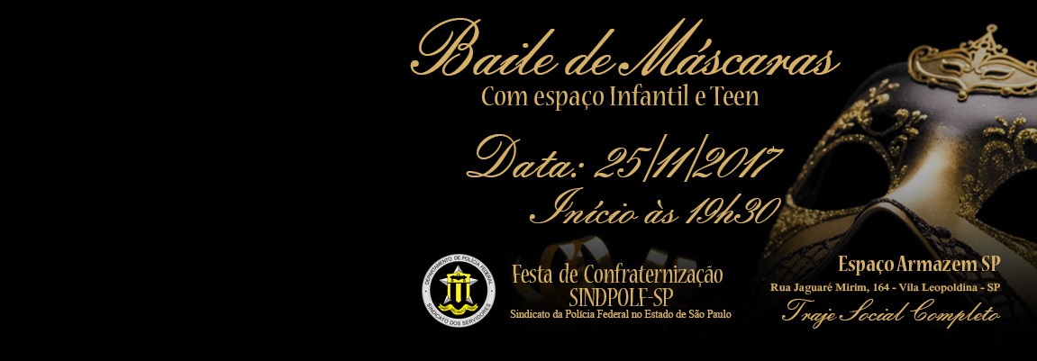 Todos os sindicalizados e seus dependentes estão convidados para o Baile de Máscaras do SINDPOLF/SP, que contará, ainda, com espaço infantil e teen. Mas é indispensável a apresentação do convite individual, que deve ser retirado na Sede (Rua Belchior Carneiro, 323, Lapa de Baixo), entre os dias 1 e 23 de novembro.