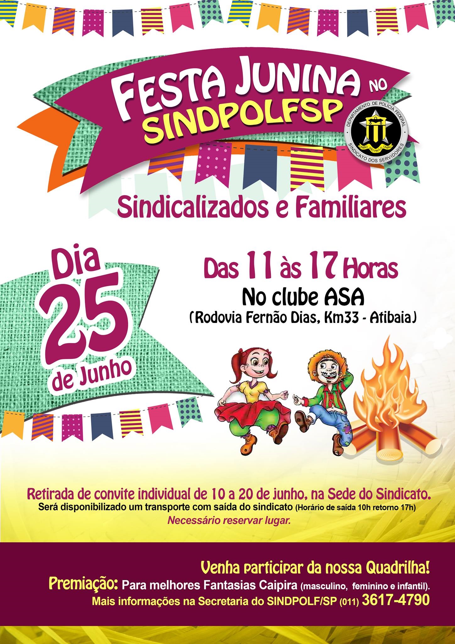 No dia 25 de junho, o SINDPOLF/SP promoverá para sindicalizados e familiares, festa junina no Clube ASA- Rodovia Fernão Dias, Km33, em Atibaia, das 10 às 17 horas.