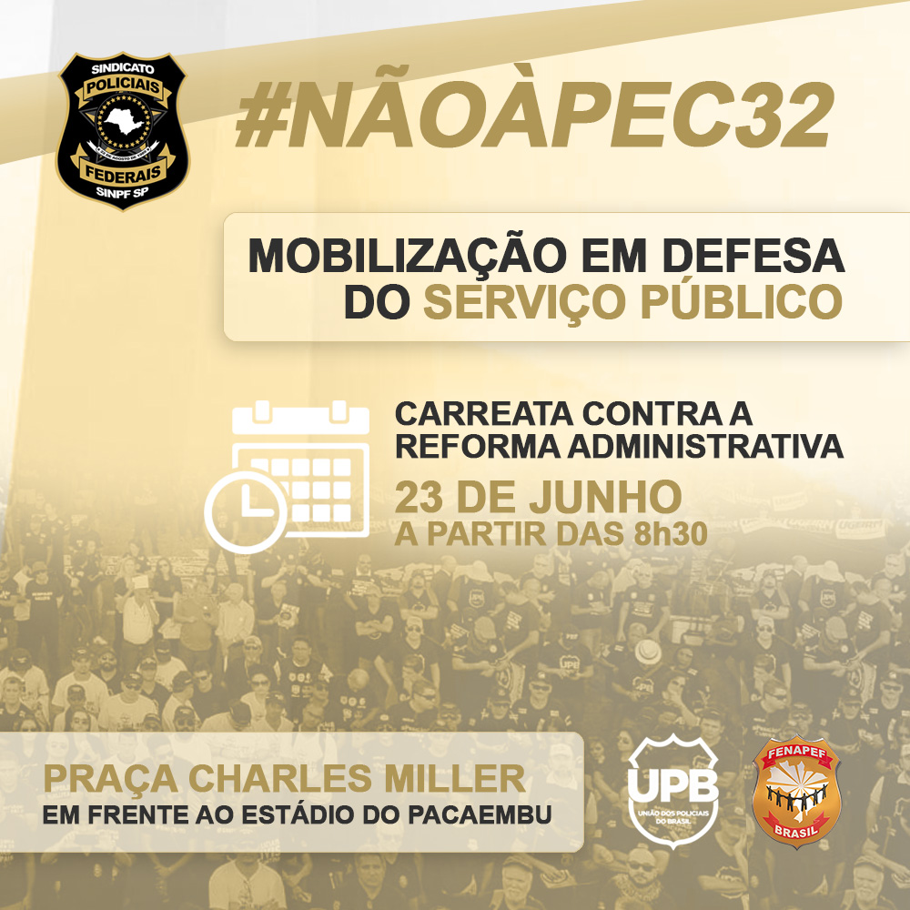 Com base em comunicado divulgado pela Fenapef (nº. 02/21 – PEC 32), o SINPF/SP convoca seus filiados para participar de manifestação do serviço público contra o projeto de Reforma Administrativa que tramita no Congresso Nacional (PEC 32), a ser realizada amanhã, 23/6, às 8h30, na Praça Charles Miller (em frente ao Estádio do Pacaembu).