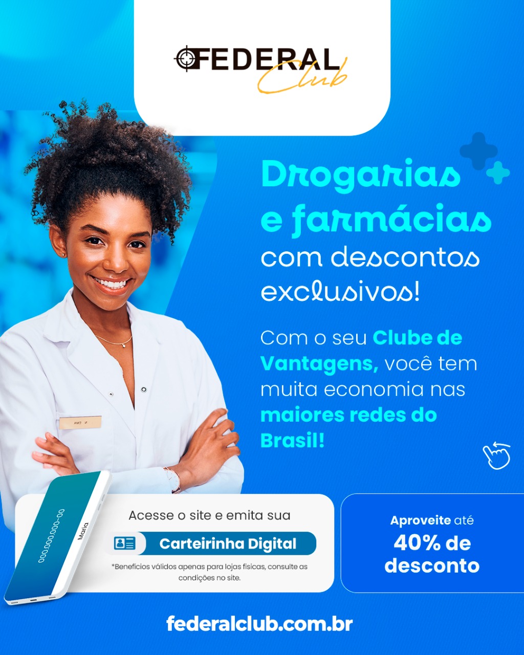 • Drogarias e farmácias com descontos exclusivos no clube de vantagens do Federal Club