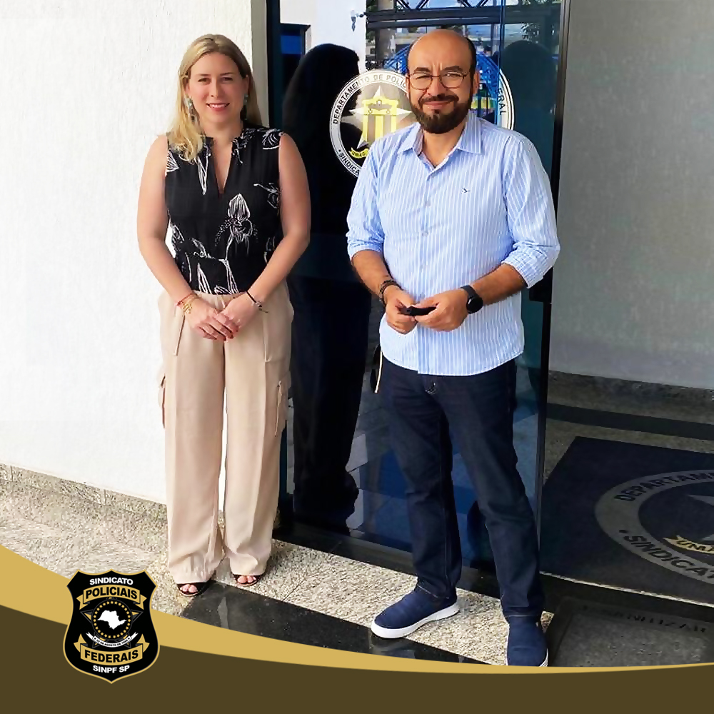 O presidente do sindicato da Polícia Rodoviária Federal (PRF), Fábio Almeida, visitou o Sindicato dos Policiais Federais no Estado de São Paulo, e foi recebido pela presidente do SINPF/SP, Susanna do Val Moore.