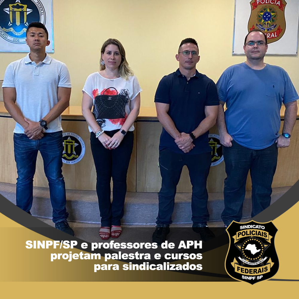 O Sindicato dos Policiais Federais no Estado de São Paulo recebeu nesta quarta-feira (16/12) professores de APH (Atendimento Pré-Hospitalar) da Tatical Response, em parceria com o ODocCaveira, para planejarem palestra e cursos aos sindicalizados. A presidente do SINPF/SP, Susanna do Val Moore, se reuniu com Rodrigo Tadeu Rodrigues Silvestre, capitão médico da Polícia Militar de SP e oficial médico de operações especiais da PMSP; Ricardo Lilla Filho, instrutor de Armamento e Tiro e APH Tático; e Tenente Akira, oficial da PMESP e instrutor da Tatical Response.