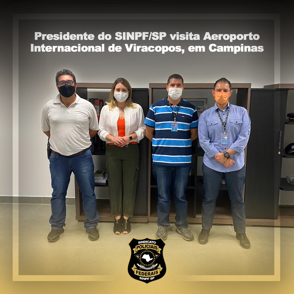 A presidente do Sindicato dos Policiais Federais no Estado de SP (SINPF/SP), Susanna do Val Moore, esteve nesta quinta-feira (29/01) no Aeroporto de Viracopos, em Campinas, onde encontrou o chefe do aeroporto, DPF Fabio André Lopes Simões, o representante sindical APF Gebara e o PPF Alex Haulti. Na ocasião, Susanna visitou as instalações e conversou com os profissionais da categoria que atuam no local para identificar gargalos, viabilizar melhorias e projetar novas oportunidades para os policiais federais.
