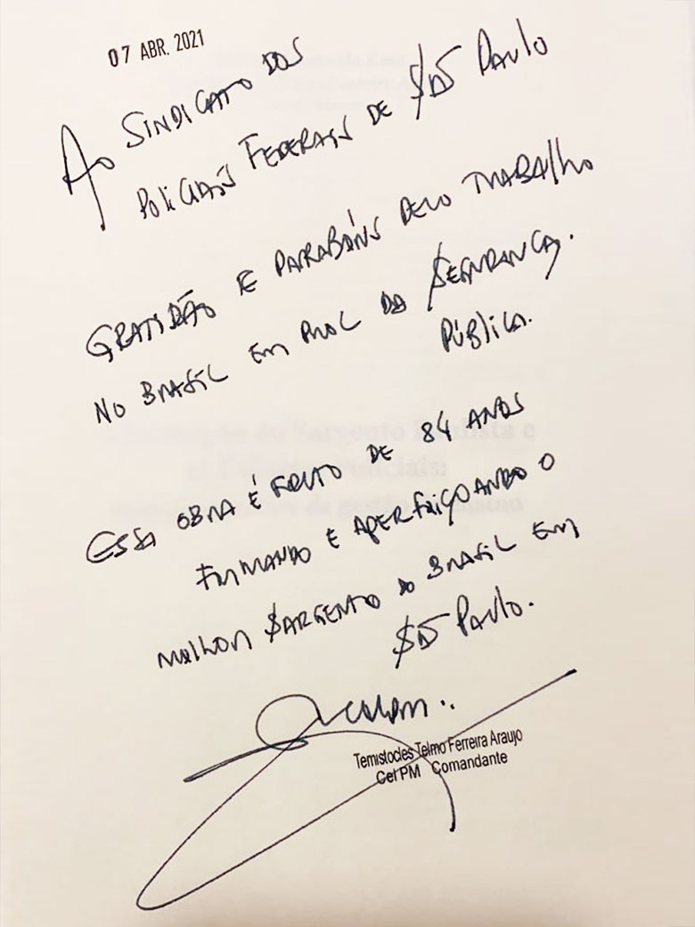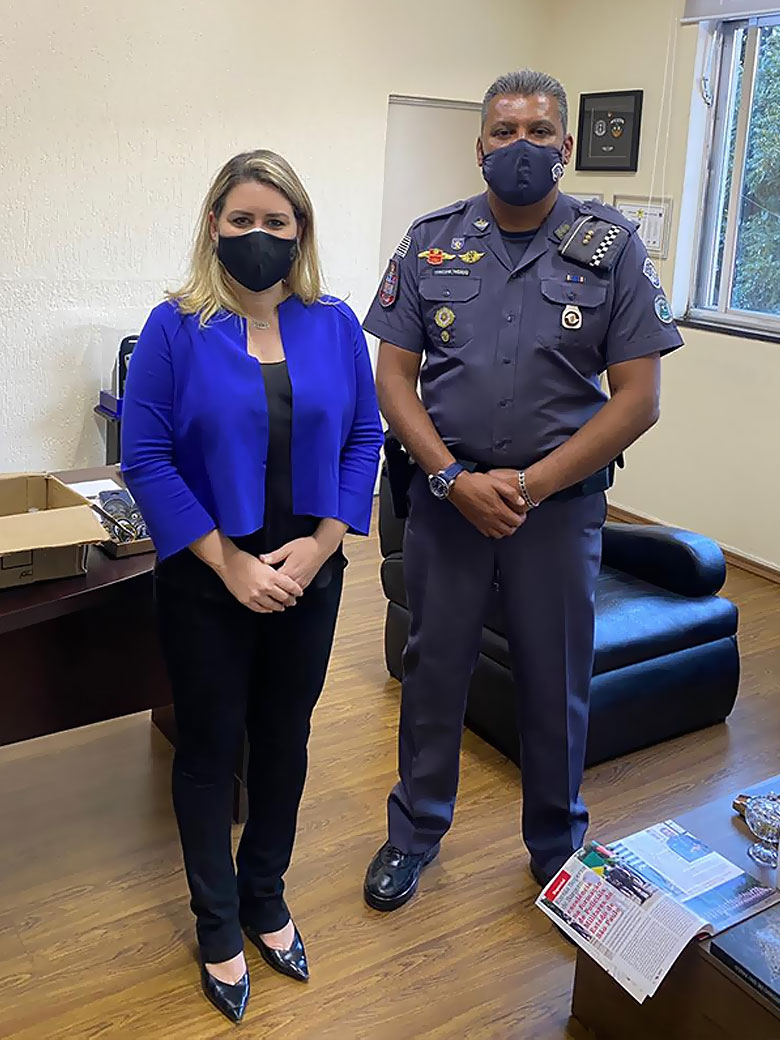 No encontro com o Comandante, Susanna conversou sobre cursos e parcerias, e não deixou de agradecer o esforço que a PM está fazendo para vacinar todos os membros das Forças de Segurança Pública. O Comandante presenteou Susanna com um livro, demonstrando carinho pelo SINPF/SP.