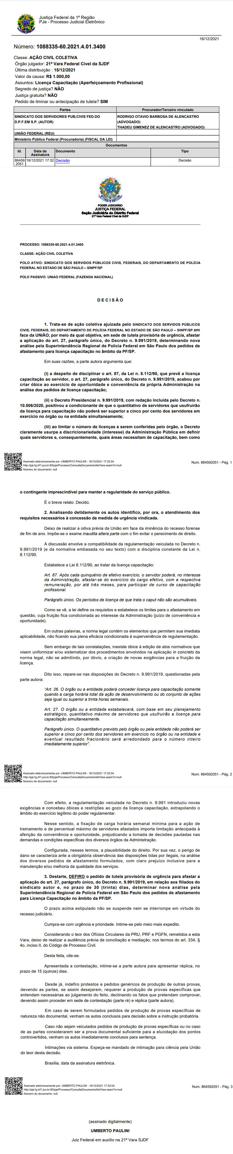 No dia 16/12/2021 o Juiz Federal da 21ª Vara SJDF deferiu o pedido de tutela provisória de urgência no bojo da ação civil coletiva nº 1088335-60.2021.4.01.3400 para afastar a aplicação do art. 27, parágrafo único, do Decreto n. 9.991/2019, em relação aos filiados do sindicato autor e determinou realização de nova análise pela Superintendência Regional de Polícia Federal em São Paulo dos pedidos de afastamento para Licença Capacitação no âmbito da PF/SP num prazo de 30 (trinta) dias.