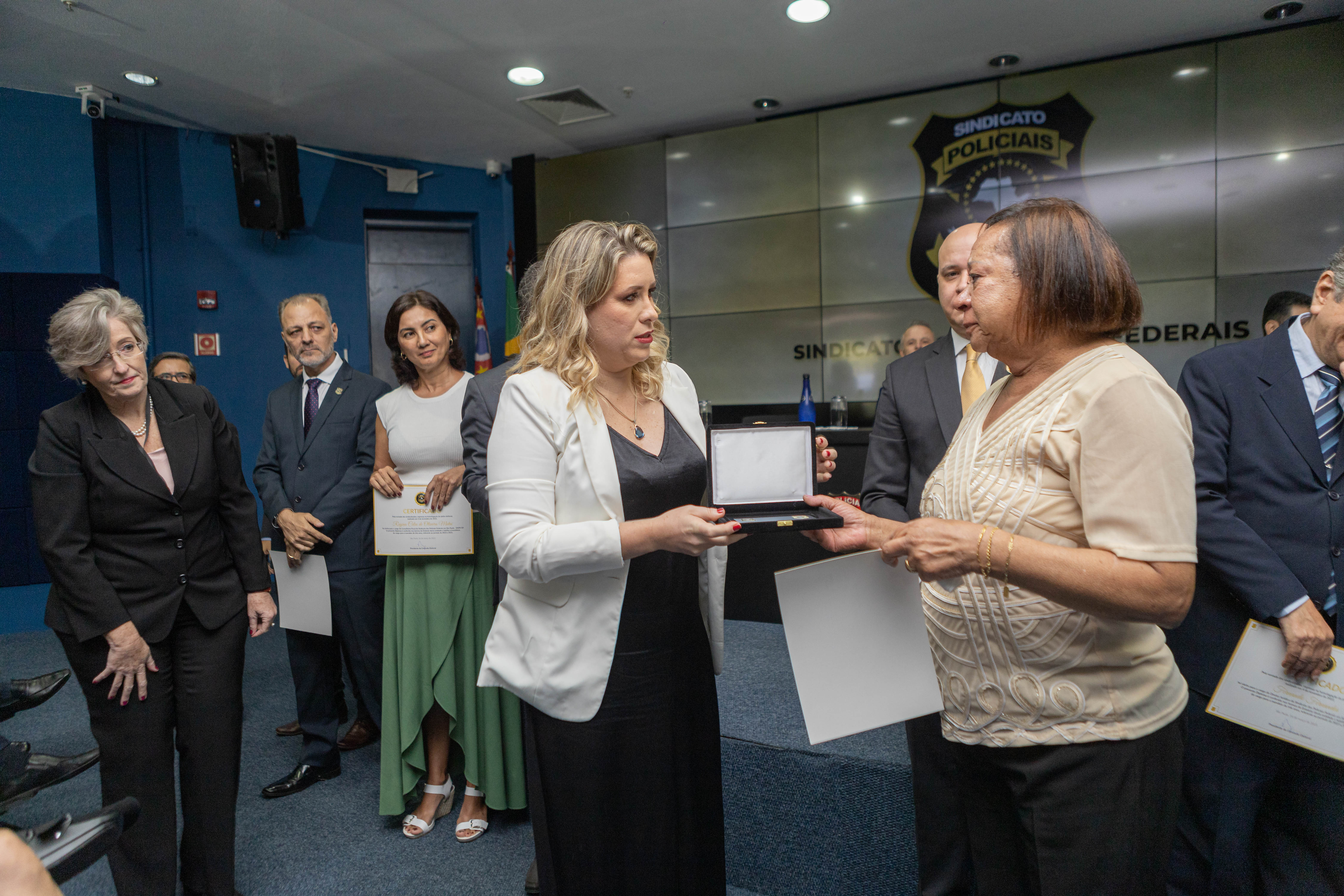 Um dos pontos altos da sessão solene foi a diplomação da Diretoria-Executiva e a homenagem póstuma a Paul Hoffberg, policial federal sindicalizado que faleceu em 28/12/2023. A viúva, Hermelinda Hoffberg, foi quem recebeu a placa de bronze em reconhecimento aos serviços prestados pelo marido, não apenas em operações da PF, como também na qualidade de sindicalizado no SINPF/SP.