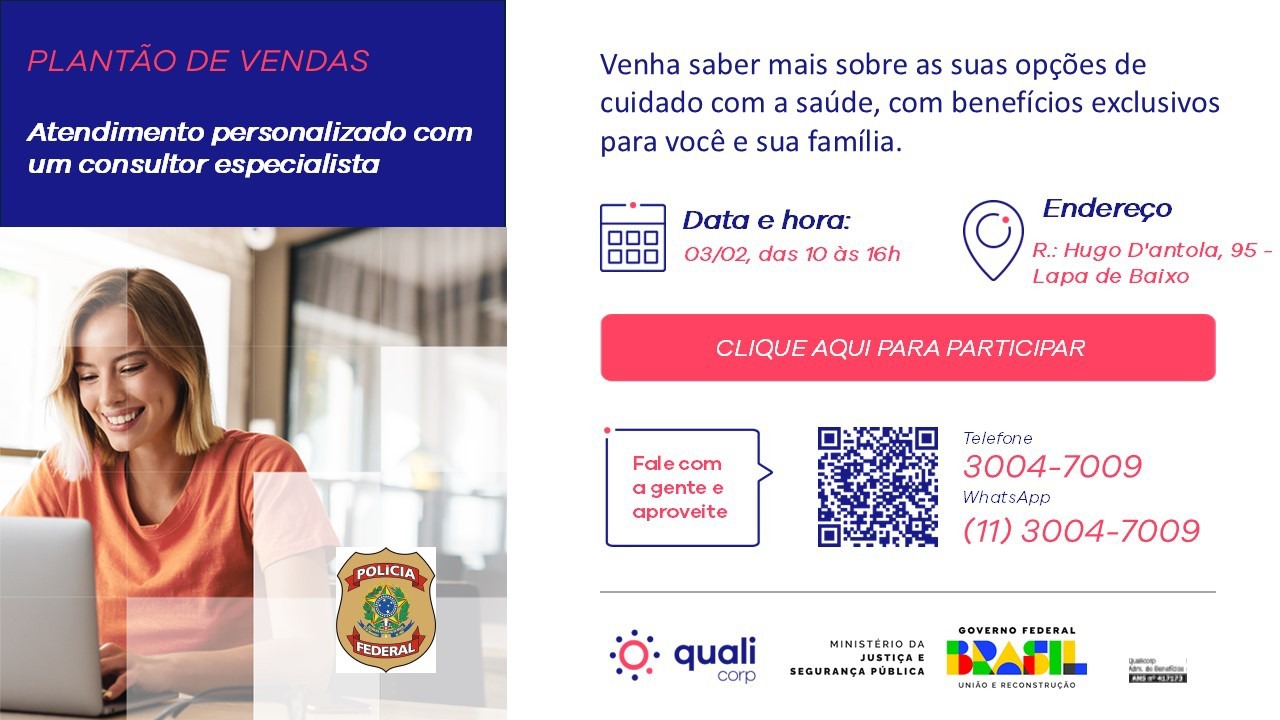 Com o objetivo de auxiliar os servidores federais da PF na escolha do plano de saúde mais adequado às suas necessidades e orçamento, a Qualicorp irá apresentar na próxima semana, suas opções de cuidados com a saúde e os benefícios oferecidos aos colegas e suas famílias.