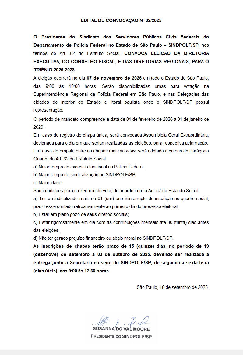 O Presidente do Sindicato dos Servidores Públicos Civis Federais do Departamento de Polícia Federal no Estado de São Paulo – SINDPOLF/SP, nos termos do Art. 62 do Estatuto Social, CONVOCA ELEIÇÃO DA DIRETORIA EXECUTIVA, DO CONSELHO FISCAL, E DAS DIRETORIAS REGIONAIS, PARA O TRIÊNIO 2026-2028.