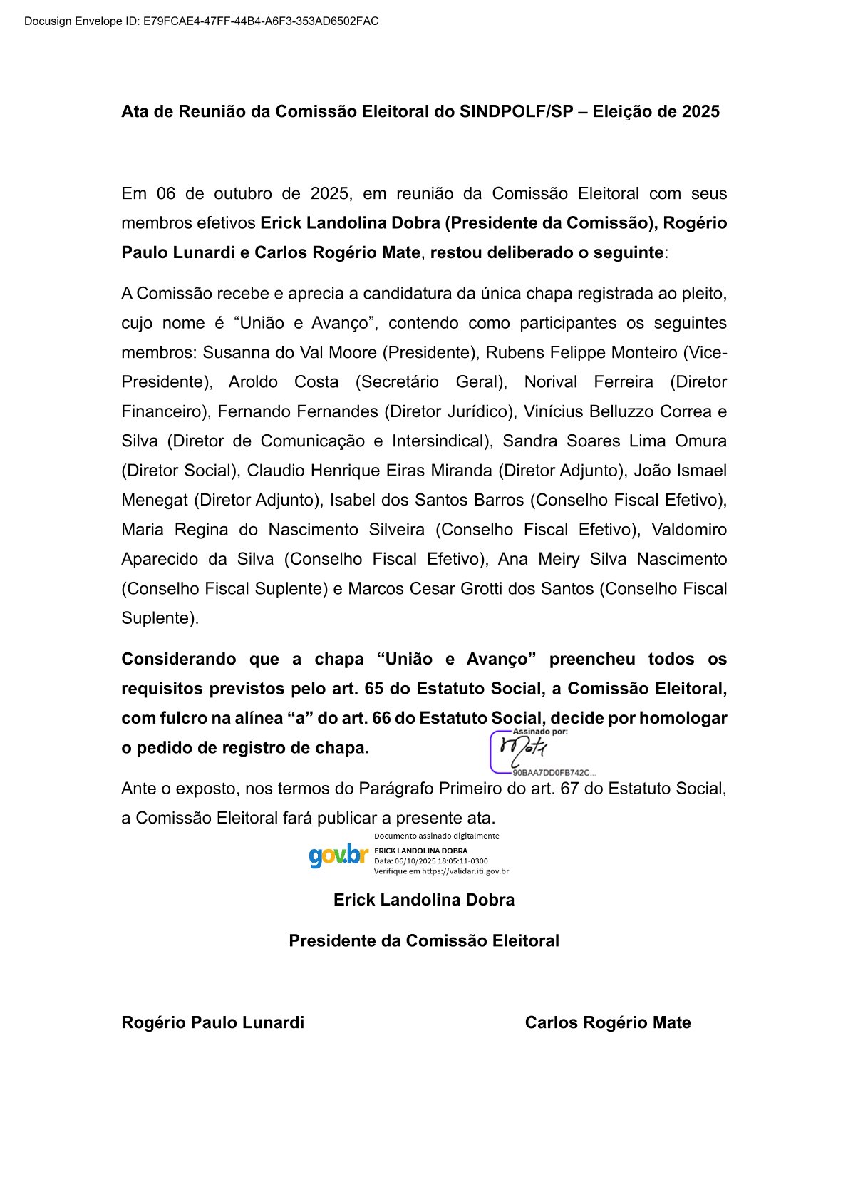 Em 06 de outubro de 2025, em reunião da Comissão Eleitoral com seus membros efetivos Erick Landolina Dobra (Presidente da Comissão), Rogério Paulo Lunardi e Carlos Rogério Mate, restou deliberado o seguinte: