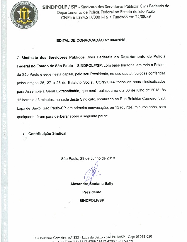 O Sindicato dos Servidores Públicos Civis Federais do Departamento de Polícia Federal no Estado de São Paulo – SINDPOLF/SP, com base territorial em todo o Estado de São Paulo e sede nesta capital, pelo seu Presidente, no uso das atribuições conferidas pelos artigos 26, 27 e 28 do Estatuto Social, CONVOCA todos os seus sindicalizados para Assembleia Geral Extraordinária, que será realizada no dia 03 de julho de 2018, às 12 horas e 45 minutos, na sede deste Sindicato, localizado na Rua Belchior Carneiro, 323, Lapa de Baixo, São Paulo-SP, em primeira convocação, ou 15 (quinze) minutos após, com qualquer quórum para deliberar sobre a seguinte pauta: