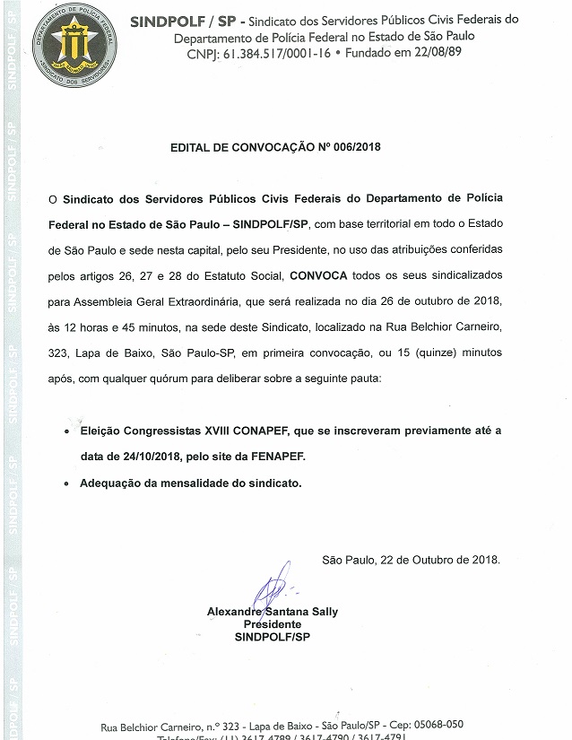 O Sindicato dos Servidores Públicos Civis Federais do Departamento de Polícia Federal no Estado de São Paulo – SINDPOLF/SP, com base territorial em todo o Estado de São Paulo e sede nesta capital, pelo seu Presidente, no uso das atribuições conferidas pelos artigos 26, 27 e 28 do Estatuto Social, CONVOCA todos os seus sindicalizados para Assembleia Geral Extraordinária, que será realizada no dia 26 de outubro de 2018, às 12 horas e 45 minutos, na sede deste Sindicato, localizado na Rua Belchior Carneiro, 323, Lapa de Baixo, São Paulo-SP, em primeira convocação, ou 15 (quinze) minutos após, com qualquer quórum para deliberar sobre a seguinte pauta: