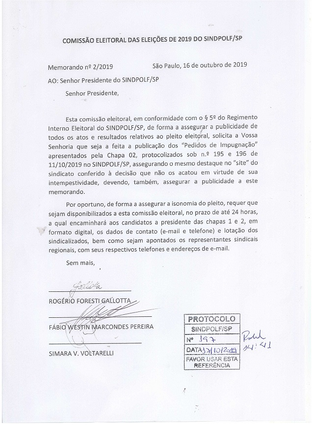 Segue para conhecimento de todos, solicitação da Comissão Eleitoral 2019 e resposta do presidente do SINDPOLF/SP, Alexandre Santana Sally. Abaixo