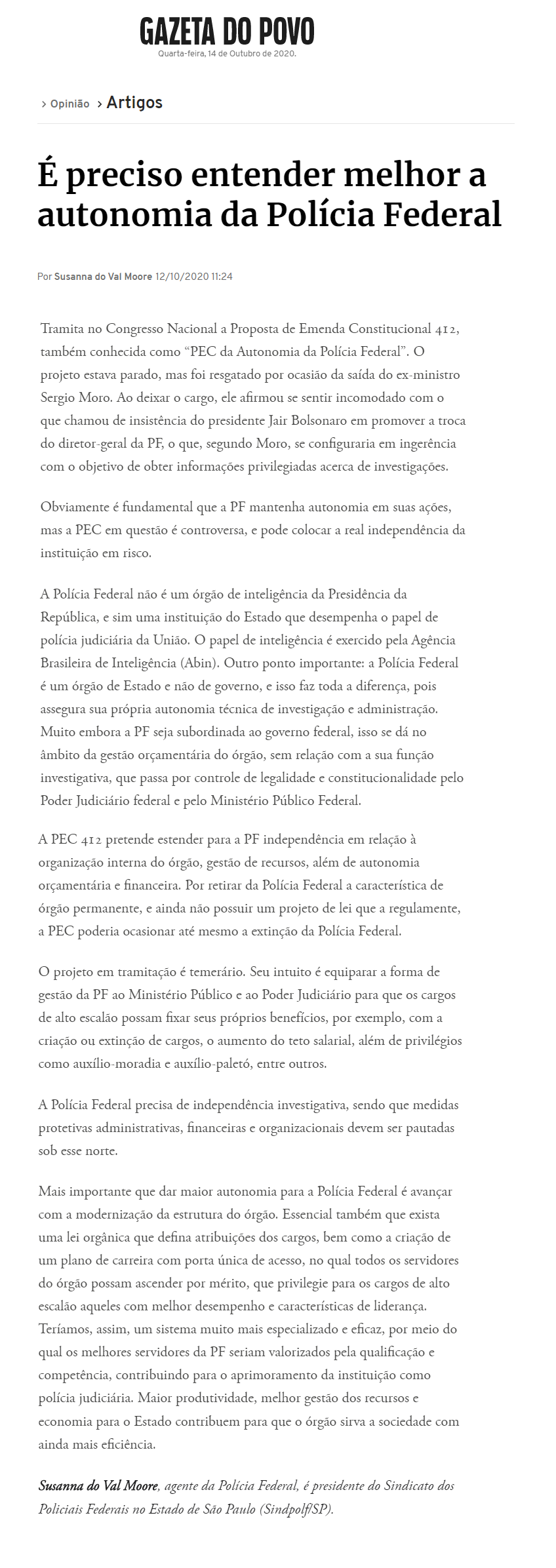 O artigo da presidente do SINPF-SP, Susanna do Val Moore, sobre a autonomia da PF, divulgado pela Folha de S. Paulo no dia 25/09, ganhou ampla repercussão na imprensa. O texto também foi publicado pelos jornais A Tribuna de Santos, Correio Popular e Gazeta do Povo.