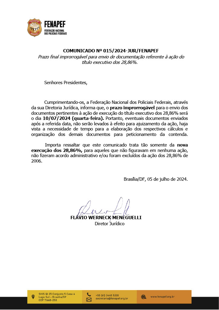 O Sinpf/SP publica comunicado de número Nº 015/2024-JUR/FENAPEF e informa que o prazo improrrogável para o envio dos documentos pertinentes à ação de execução do título executivo dos 28,86% será o dia *10/07/2024 (quarta-feira)*. Eventuais documentos enviados após a referida data, não serão levados a efeito para ajuizamento da ação, haja vista a necessidade de tempo para a elaboração dos respectivos cálculos e organização dos demais documentos para peticionamento da contenda.
