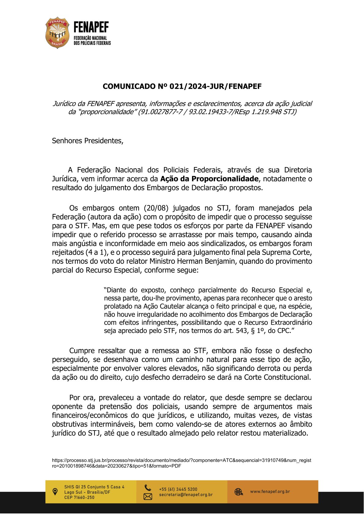 O SINPF/SP divulga comunicado da Fenapef com informações e esclarecimentos, acerca da ação judicial da “proporcionalidade” (91.0027877-7 / 93.02.19433-7/REsp 1.219.948 STJ). Veja abaixo: