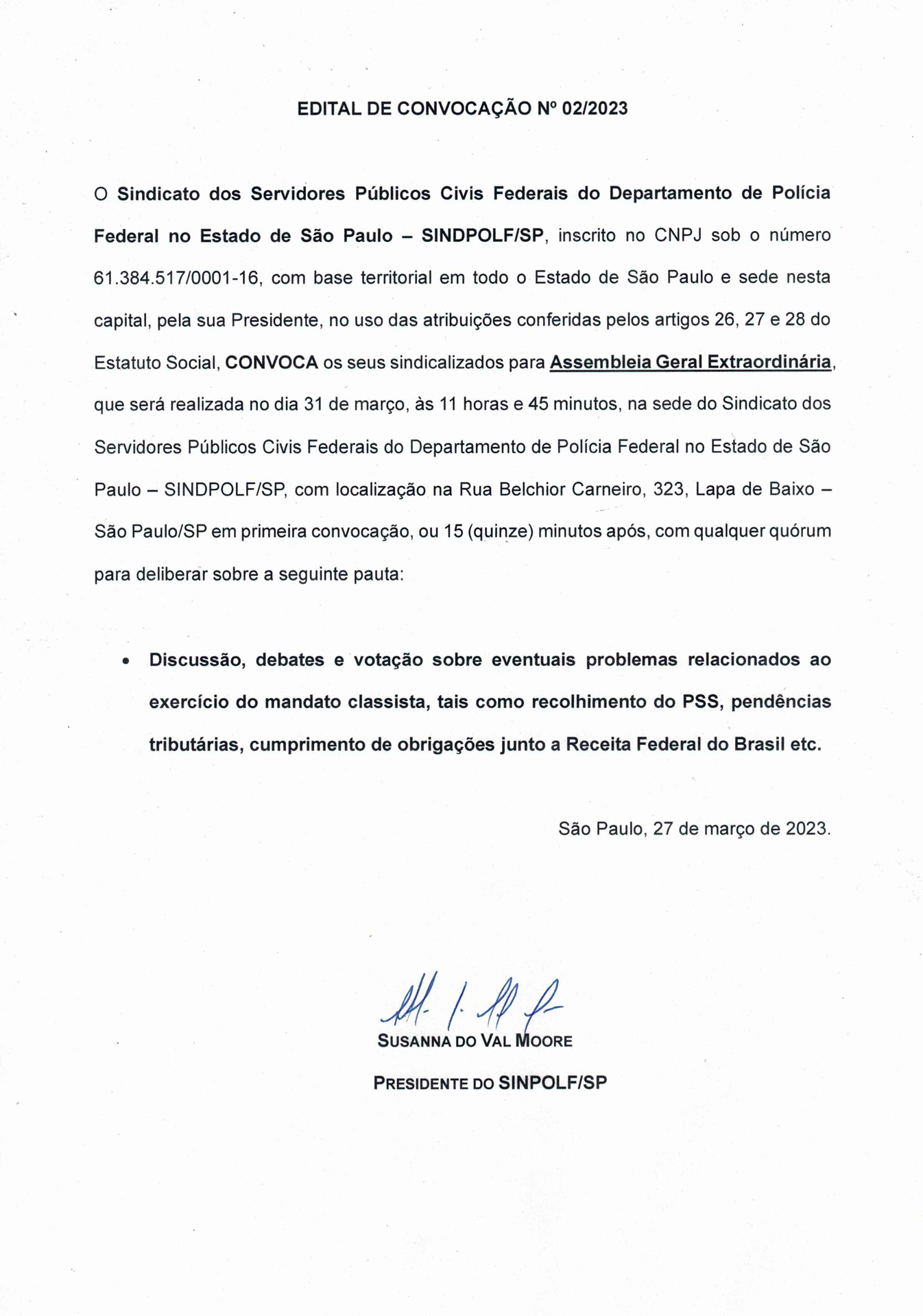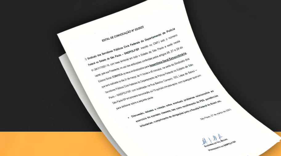 O Sindicato dos Policiais Federais em São Paulo convoca os seus sindicalizados para Assembleia Geral Extraordinária, que será realizada no dia 31 de março, às 11 horas e 45 minutos, na sede do Sindicato dos Servidores Públicos Civis Federais do Departamento de Polícia Federal no Estado de São Paulo – SINDPOLF/SP.