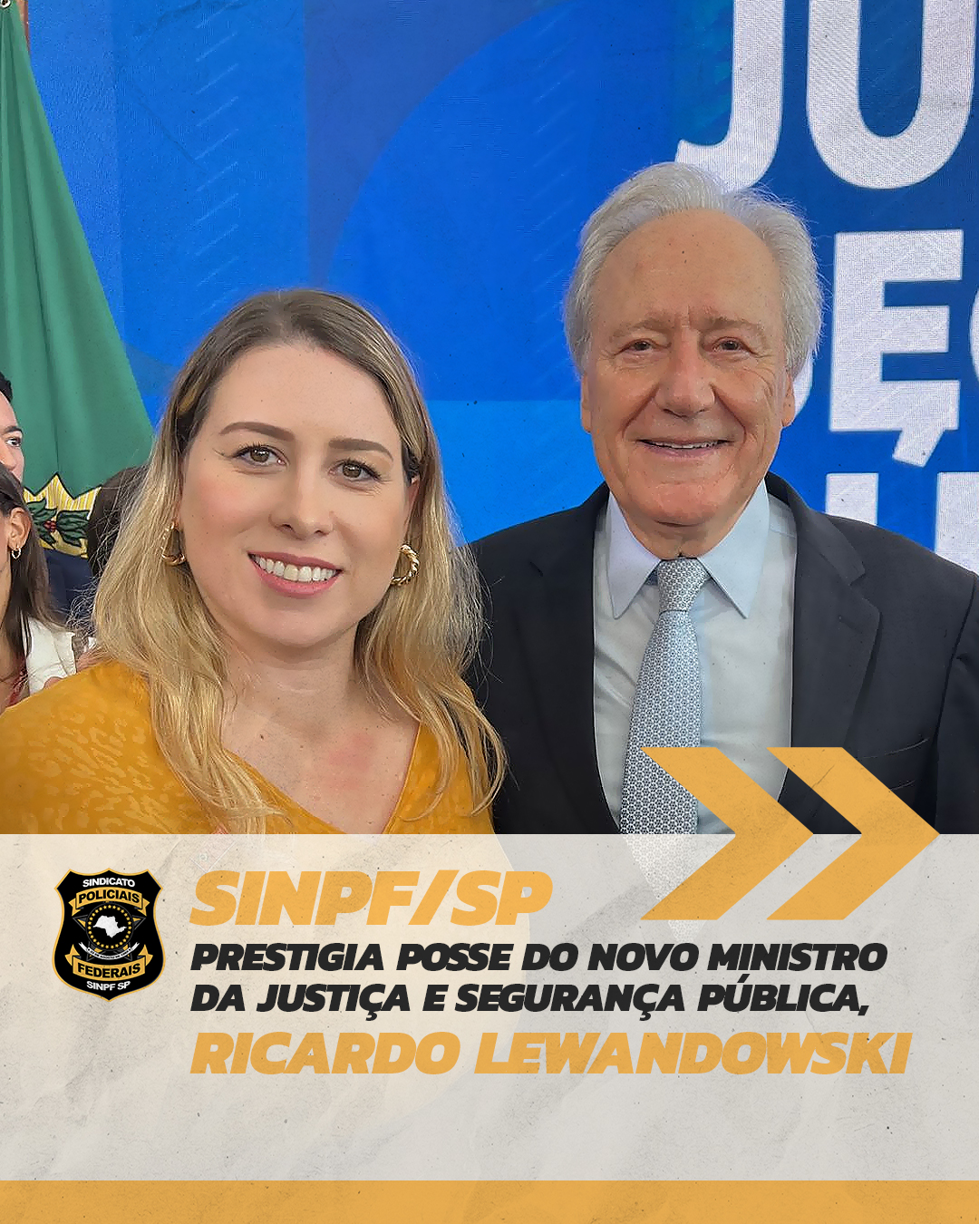 A presidente do Sindicato dos Policiais Federais em São Paulo (SINPF/SP), Susanna do Val Moore, participou na manhã da última quinta-feira (01),no Palácio do Planalto/Brasília, da posse do novo ministro da Justiça e Segurança Pública, Enrique Ricardo Lewandowski, . A Fenapef também esteve presente representada pelo presidente, Marcus Firme, e pelo diretor jurídico, Flávio Werneck Meneguelli.