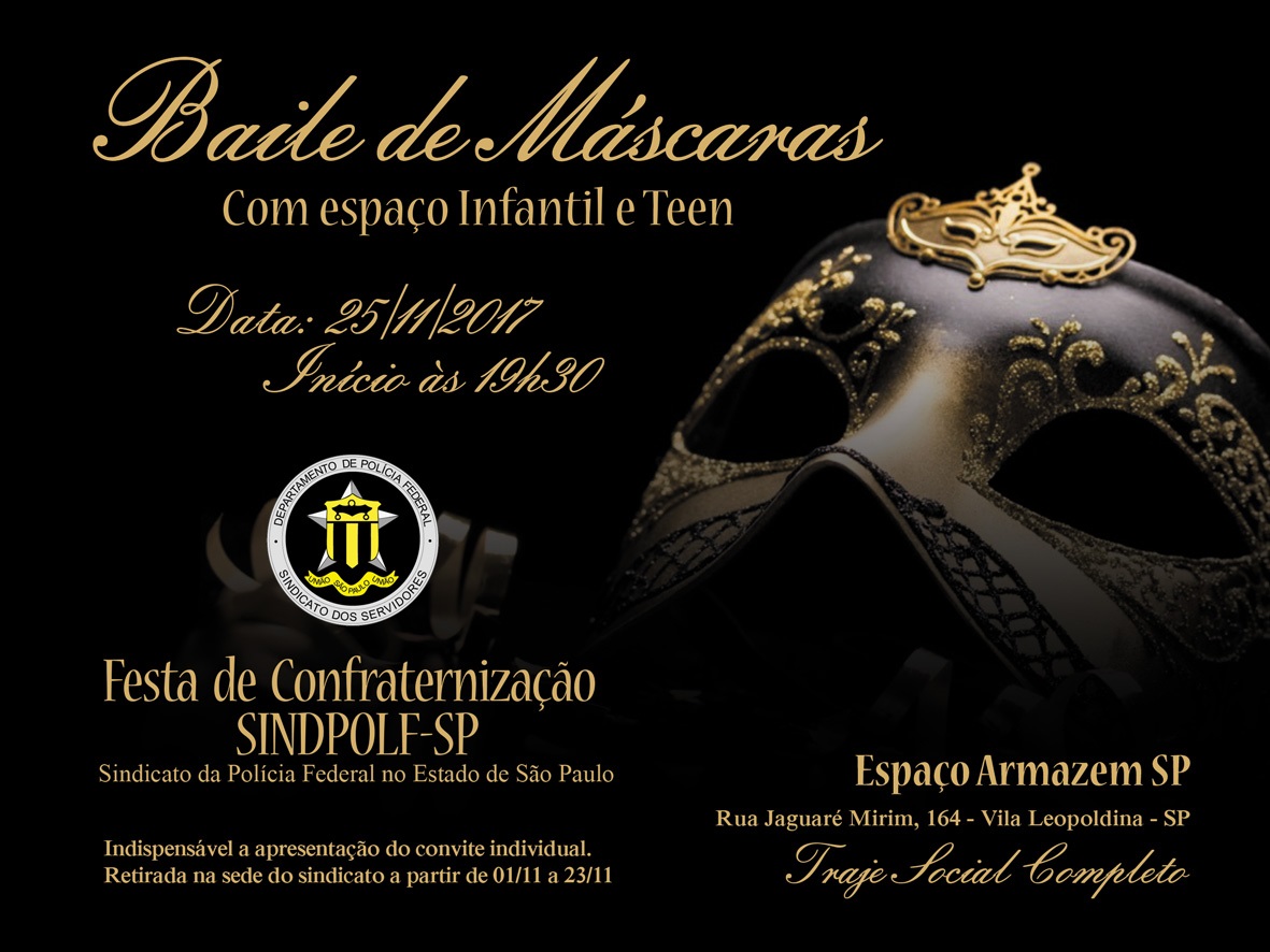 Todos os sindicalizados e seus dependentes estão convidados para o Baile de Máscaras do SINDPOLF/SP, que contará, ainda, com espaço infantil e teen. Mas é indispensável a apresentação do convite individual, que deve ser retirado na Sede (Rua Belchior Carneiro, 323, Lapa de Baixo), entre os dias 1 e 23 de novembro.