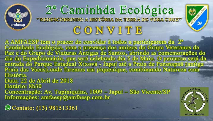 A Amfaesp (Associação dos Militares das Forças Armadas do Estado de São Paulo) convida a todos para a 2ª Caminhada Ecológica, que acontece em São Vicente (SP), domingo (22/04), a partir das 8h30.