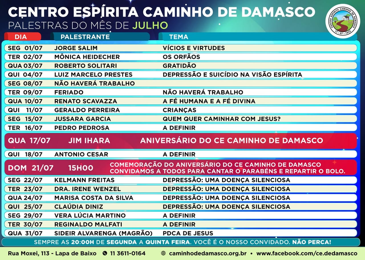 O Centro Espírita Caminho de Damasco promove a partir da próxima segunda-feira (22/072) até quinta-feira(25/07) às 20 horas, as palestras "Depressão, uma doença silenciosa". O evento será realizado à rua Moxel, 113 - Lapa de Baixo. No dia 22 teremos a participação do colega APF Kelmann Freitas desenvolvendo o tema: "Depressão e agora?".