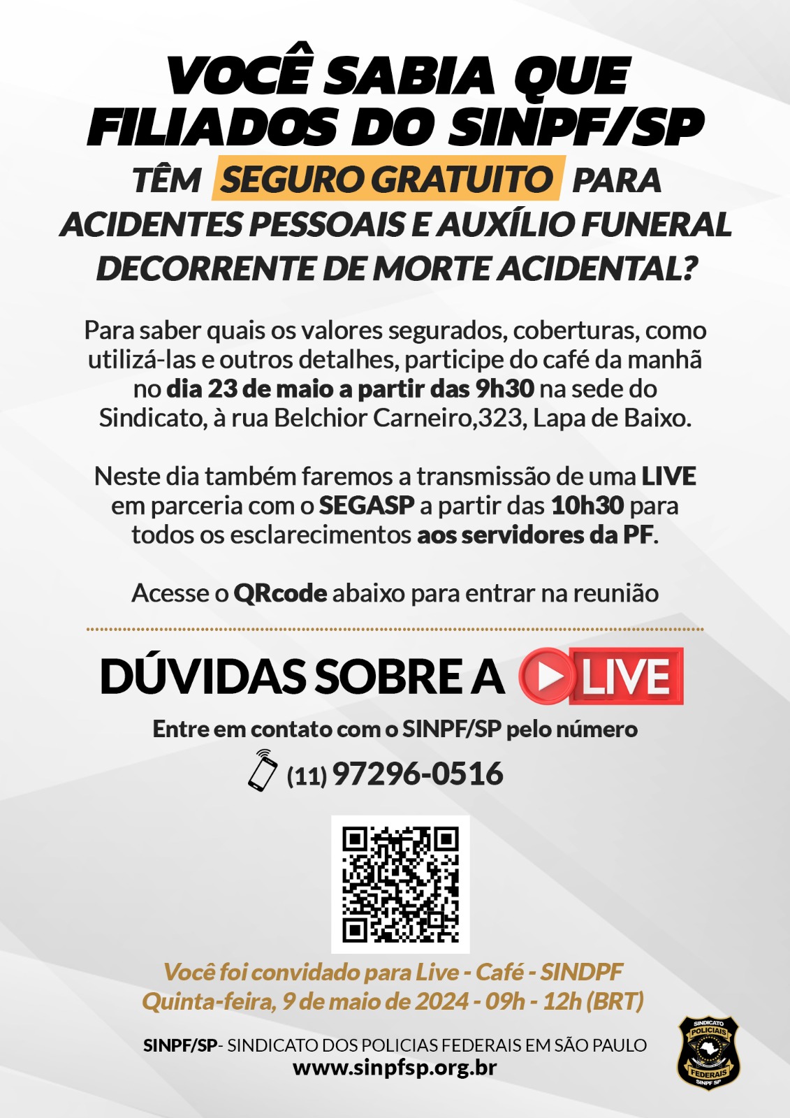 Neste dia também faremos a transmissão de uma Live em parceria com o SEGASP a partir das 10h30 para todos os esclarecimentos aos servidores da PF.