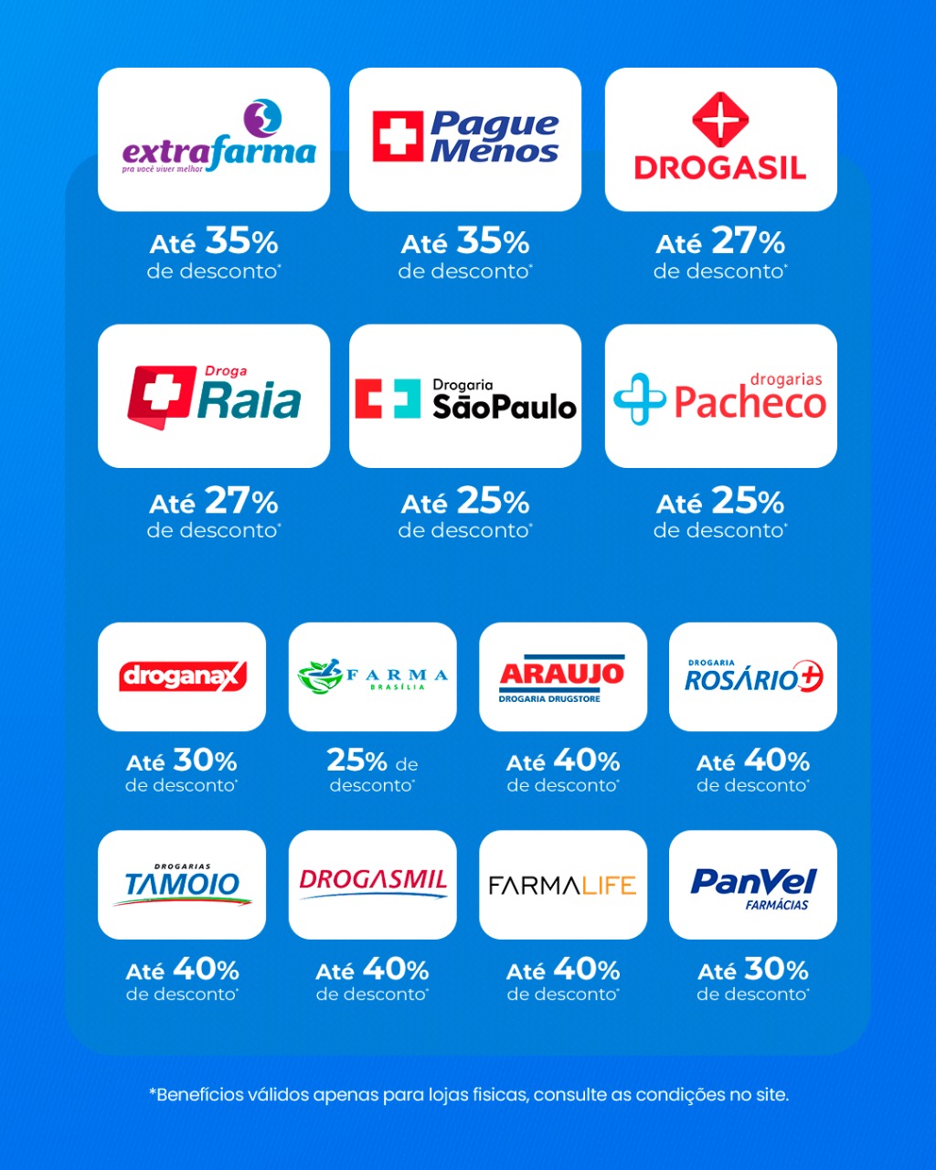 • Drogarias e farmácias com descontos exclusivos no clube de vantagens do Federal Club