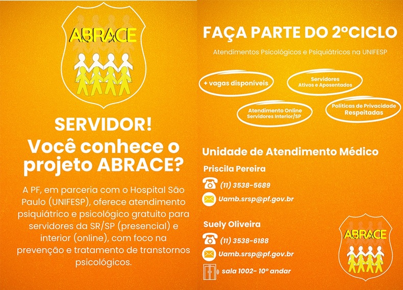 Com a finalidade de promover o bem-estar e a integração dos servidores ativos e aposentados da Polícia Federal, a SR/PF/SP estabeleceu uma parceria com o Hospital São Paulo (HSP) no âmbito do Projeto ABRACE. Essa iniciativa visa prevenir e tratar doenças relacionadas à saúde mental, disponibilizando atendimento psiquiátrico e psicológico gratuito, presencial aos colegas da capital e, por meio de teleatendimento, para os servidores das delegacias descentralizadas do interior do Estado.