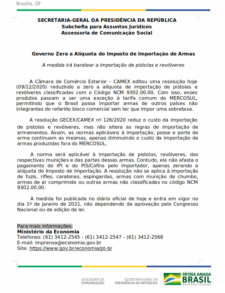 A Câmara de Comércio Exterior – CAMEX editou uma resolução hoje (09/12/2020) reduzindo a zero a alíquota de importação de pistolas e revólveres classificadas com o Código NCM 9302.00.00. Com isso, esses produtos passam a ser uma exceção à tarifa comum do MERCOSUL, permitindo que o Brasil possa importar armas de outros países não integrantes do referido bloco comercial sem ter que impor uma sobretaxa.