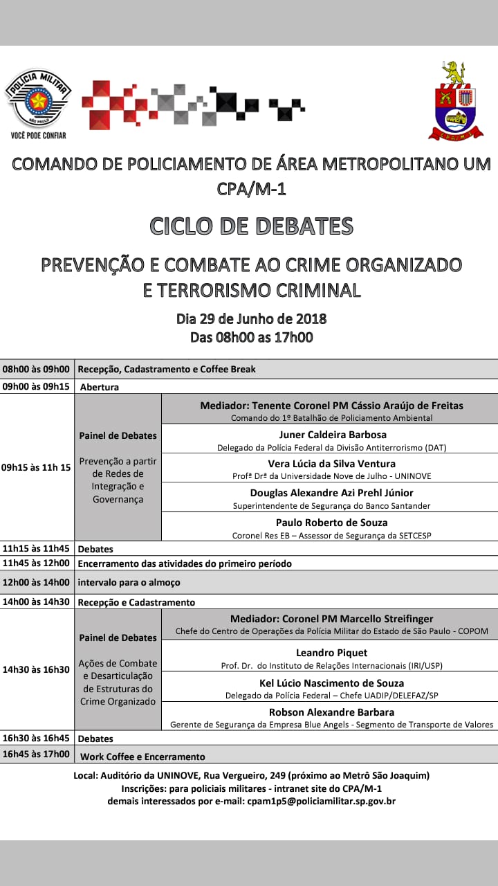 Com foco em discutir políticas de segurança pública de prevenção e combate ao crime organizado e terrorismo criminal, o Comando de Policiamento de Área Metropolitano Um - CPA/M-1 realizará o presente Ciclo de Debates com participação de Instituições Policiais, Sociedade Civil, Comunidade Universitária, Segmento Bancário e de Transporte de Valores, que servirá para diagnósticar ações de terrorismo criminal e os impactos para a sociedade e segmentos diretamente afetados. Inscrições.