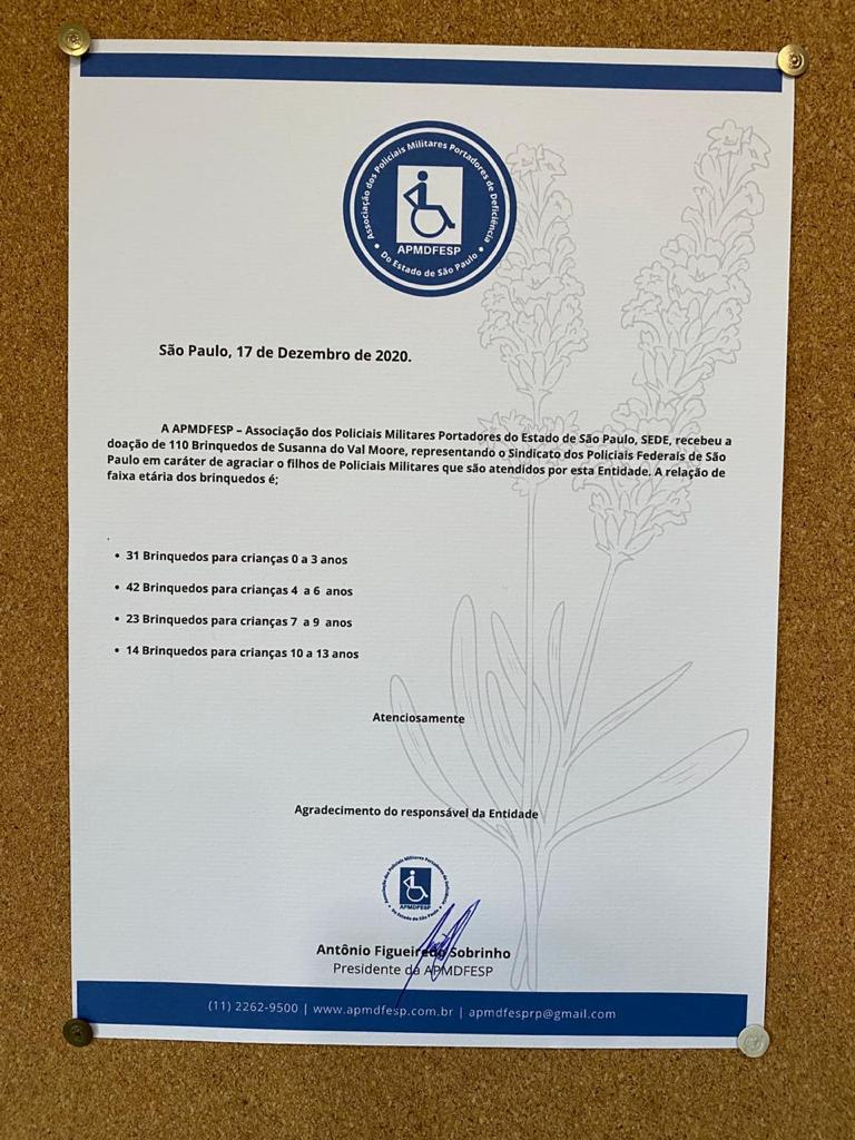 “O Presidente e toda Diretoria da APMDFESP agradecem imensamente a Susanna do Val Moore e o SINPF/SP pelo carinho representado nesta doação de brinquedos, que vai possibilitar o sorriso nos filhos de nossos heróis Policiais Militares”, agradeceu o presidente da Associação, Antonio Figueiredo Sobrinho.