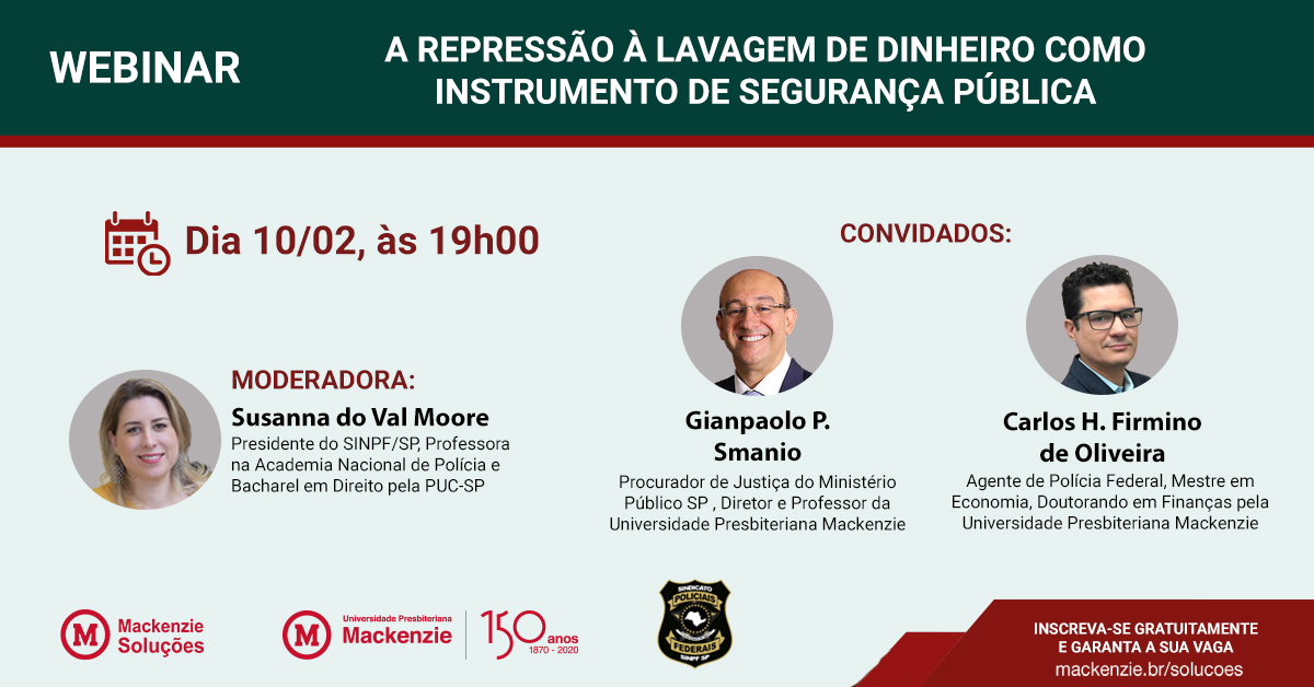 Na próxima quarta-feira, 10 de fevereiro, às 19h, será realizado o webinar "A repressão à Lavagem de dinheiro como instrumento de segurança pública", promovido pelo Instituto Presbiteriano Mackenzie e o Sindicato dos Policiais Federais no Estado de São Paulo (SINPF/SP).
