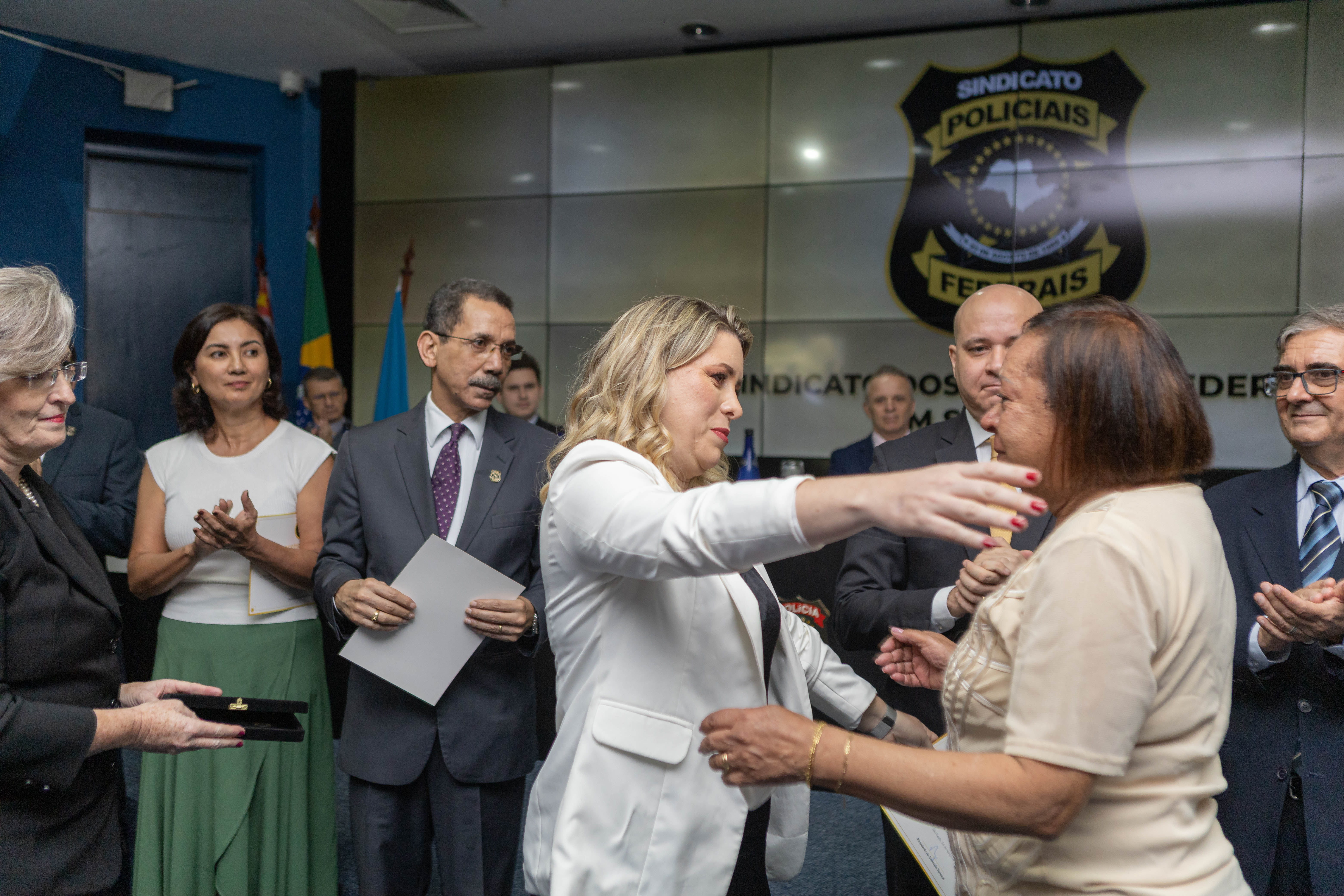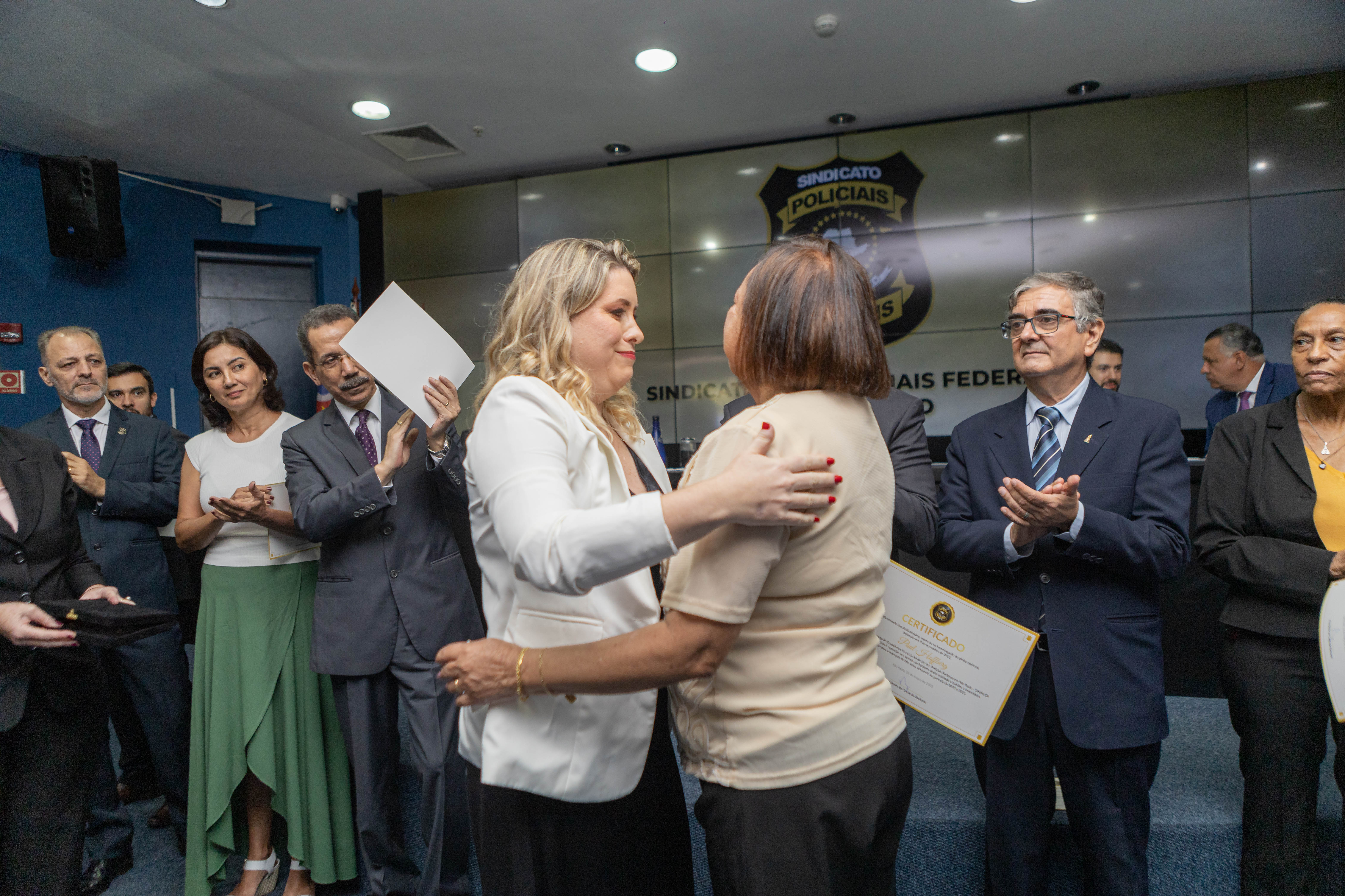 Um dos pontos altos da sessão solene foi a diplomação da Diretoria-Executiva e a homenagem póstuma a Paul Hoffberg, policial federal sindicalizado que faleceu em 28/12/2023. A viúva, Hermelinda Hoffberg, foi quem recebeu a placa de bronze em reconhecimento aos serviços prestados pelo marido, não apenas em operações da PF, como também na qualidade de sindicalizado no SINPF/SP.