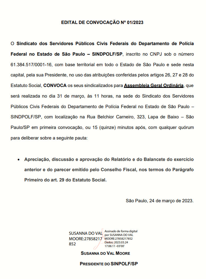 O Sindicato dos Policiais Federais em São Paulo convoca os seus sindicalizados para Assembleia Geral Ordinária, que será realizada no dia 31 de março, às 11 horas, na sede do Sindicato dos Servidores Públicos Civis Federais do Departamento de Polícia Federal no Estado de São Paulo –