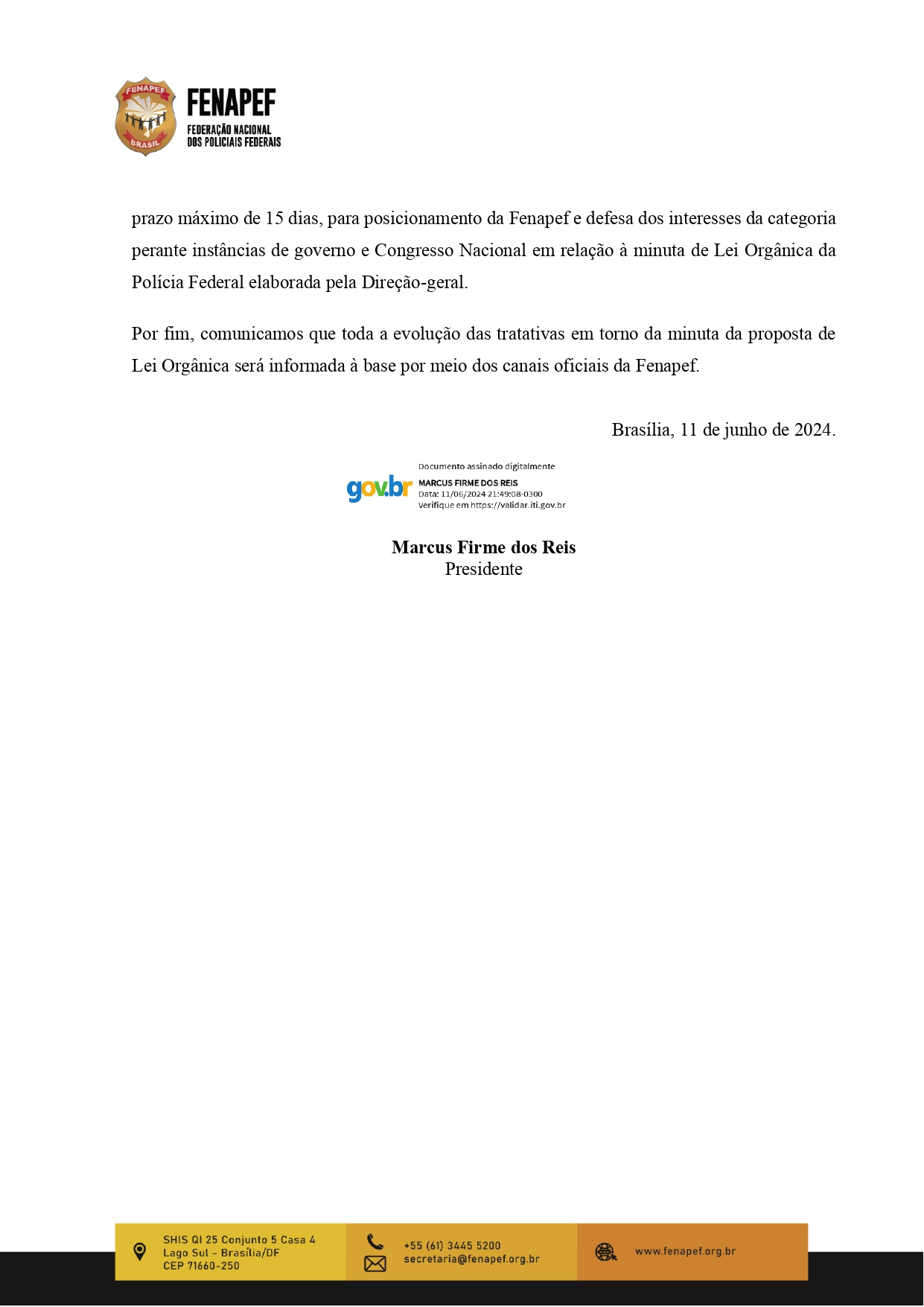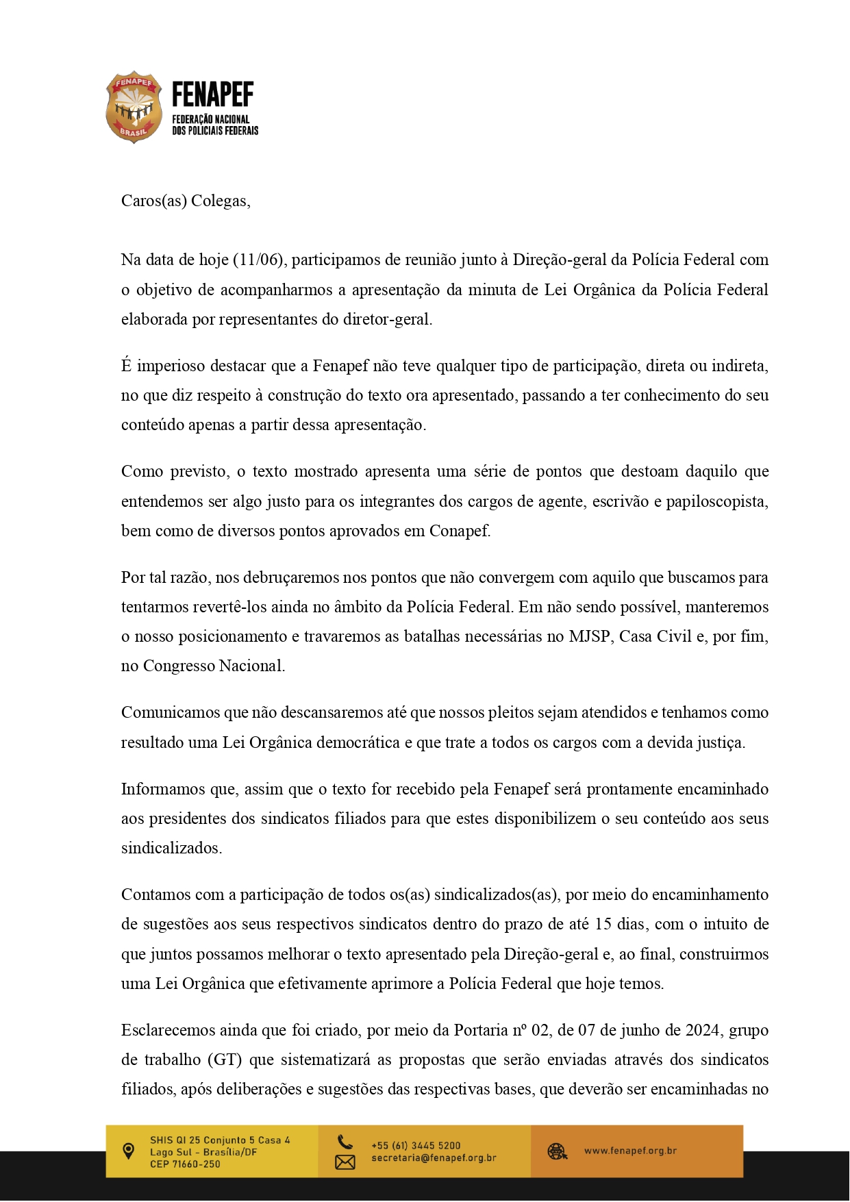 O SINFP/SP divulga abaixo comunicado da Fenapef sobre a apresentação da minuta da Lei Orgânica da PF elaborada por representantes do diretor-geral. O sindicato, por meio do presidente interino, Sérgio Bakana, convocará uma Assembleia Geral Extraordinária, na próxima semana, para todos os servidores sindicalizados e não sindicalizados, a fim de discutirem essa pauta tão importante para a categoria.