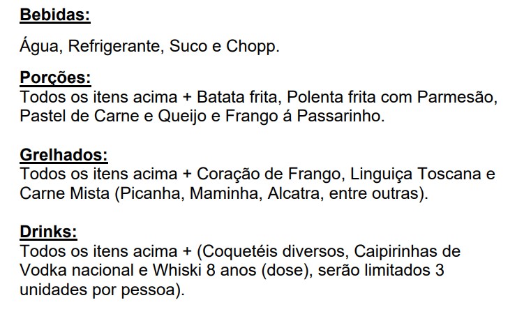 Para coquetéis diversos, caipirinha de vodka nacional e Whiski 8 anos (dose) serão 3 unidades por pessoa.