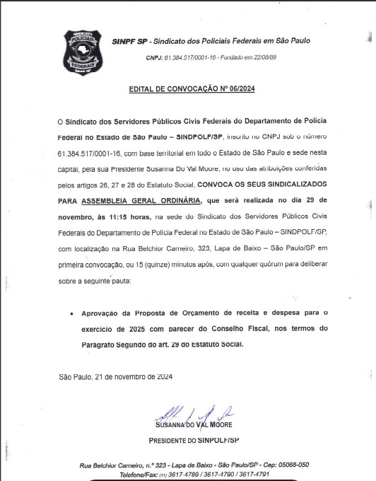 O Sindicato dos Servidores Públicos Civis Federais do Departamento de Polícia Federal no Estado de São Paulo – SINDPOLF/SP, inscrito no CNPJ sob o número 61.384.517/0001-16, com base territorial em todo o Estado de São Paulo e sede nesta capital, pela sua Presidente Susanna Do Val Moore, no uso das atribuições conferidas pelos artigos 26, 27 e 28 do Estatuto Social, CONVOCA OS SEUS SINDICALIZADOS PARA ASSEMBLEIA GERAL ORDINÁRIA, que será realizada no dia 29 de novembro, às 11:15 horas, na sede do Sindicato dos Servidores Públicos Civis Federais do Departamento de Polícia Federal no Estado de São Paulo – SINDPOLF/SP, com localização na Rua Belchior Carneiro, 323, Lapa de Baixo – São Paulo/SP em primeira convocação, ou 15 (quinze) minutos após, com qualquer quórum para deliberar sobre a seguinte pauta: