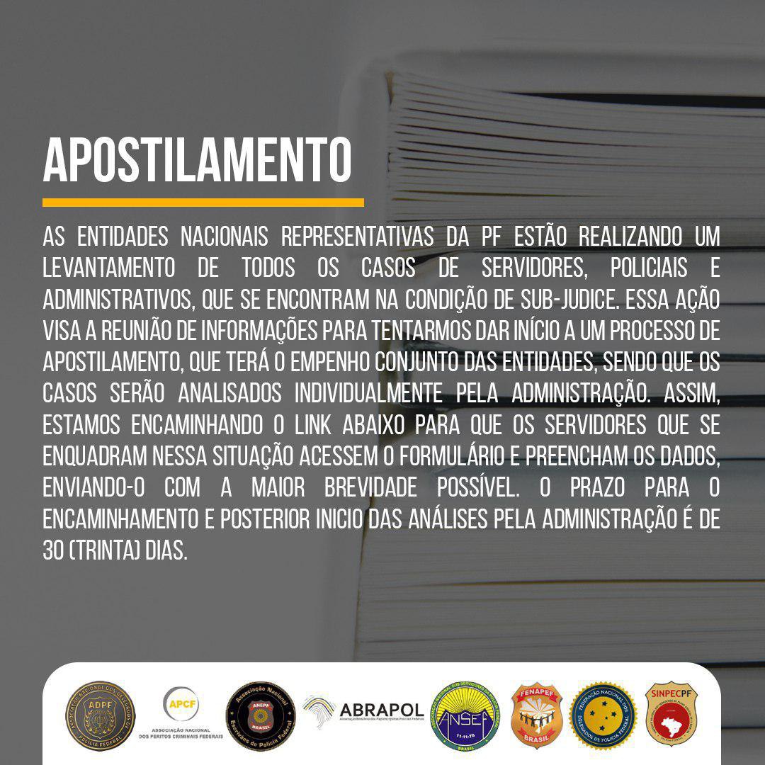 A Federação Nacional dos Policiais Federais (Fenapef) e seus sindicatos filiados realizam um levantamento de todos os casos de servidores, policiais e administrativos sindicalizados que se encontram na condição de sub judice. Essa ação visa reunir todas as informações para o esforço do processo de apostilamento que, com empenho também de outras entidades representativas, os casos sejam analisados individualmente pela administração.