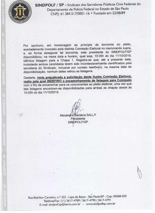 Segue para conhecimento de todos, solicitação da Comissão Eleitoral 2019 e resposta do presidente do SINDPOLF/SP, Alexandre Santana Sally. Abaixo