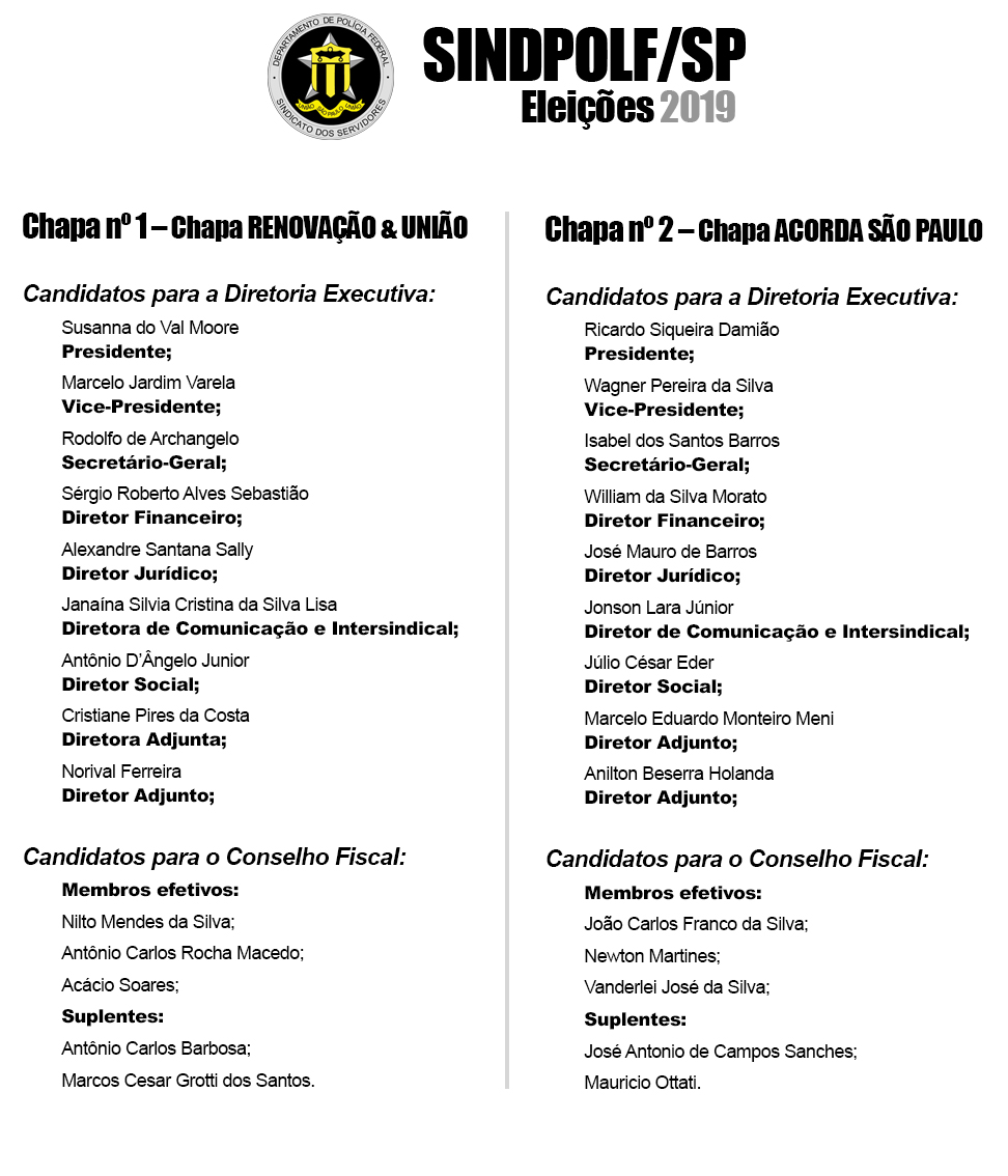 Candidatos para a Diretoria Executiva: Susanna do Val Moore – Presidente; Marcelo Jardim Varela – Vice-Presidente; Rodolfo de Archangelo – Secretário-Geral; Sérgio Roberto Alves Sebastião – Diretor Financeiro; Alexandre Santana Sally – Diretor Jurídico; Janaína Silvia Cristina da Silva Lisa – Diretora de Comunicação e Intersindical; Antônio D’Ângelo Junior – Diretor Social; Cristiane Pires da Costa – Diretora Adjunta; Norival Ferreira – Diretor Adjunto;