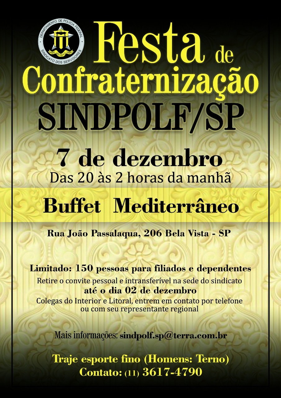 Não perca a festa de confraternização do SINDPOLF/SP, no dia 07 de dezembro a partir das 20 horas!