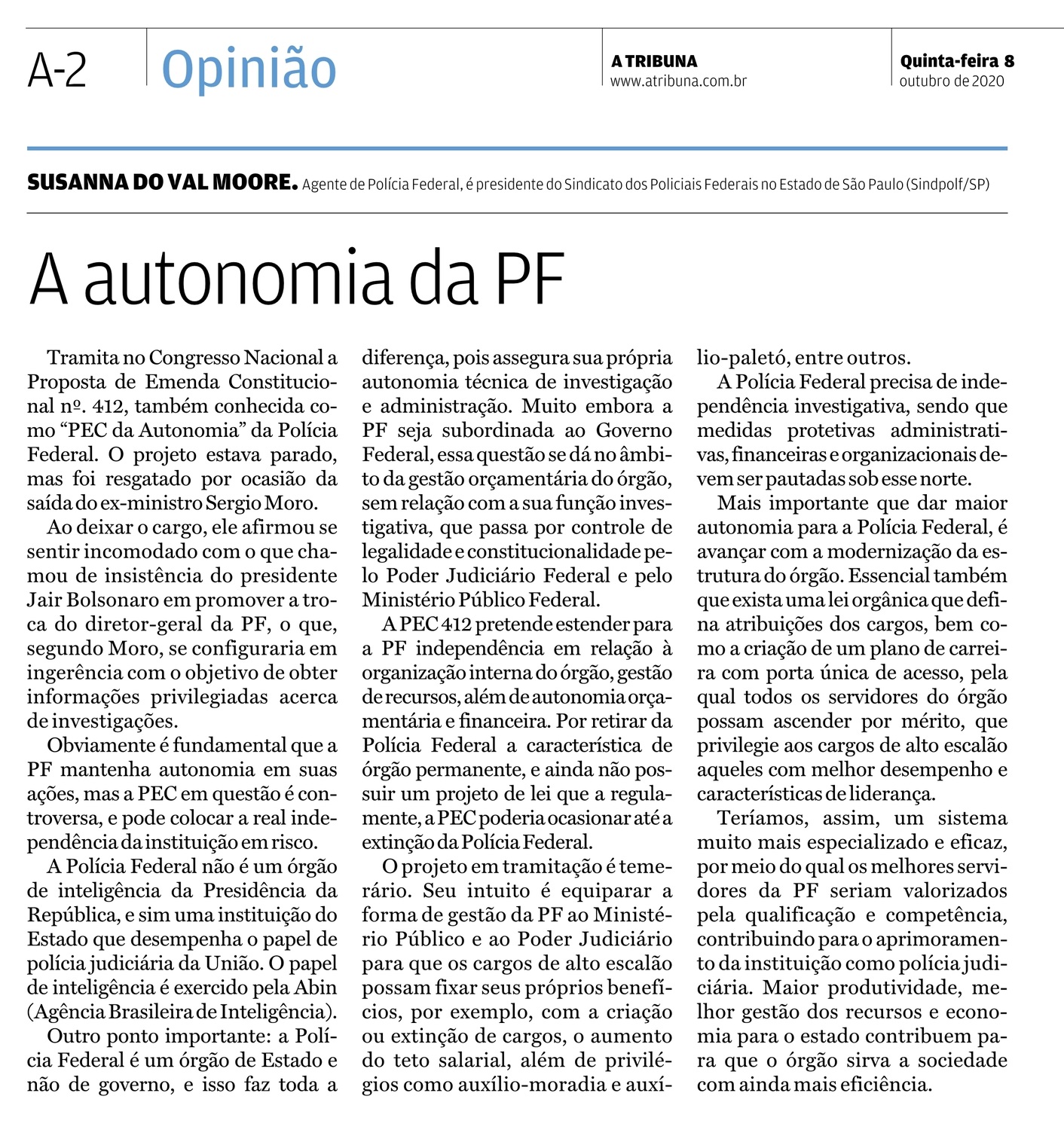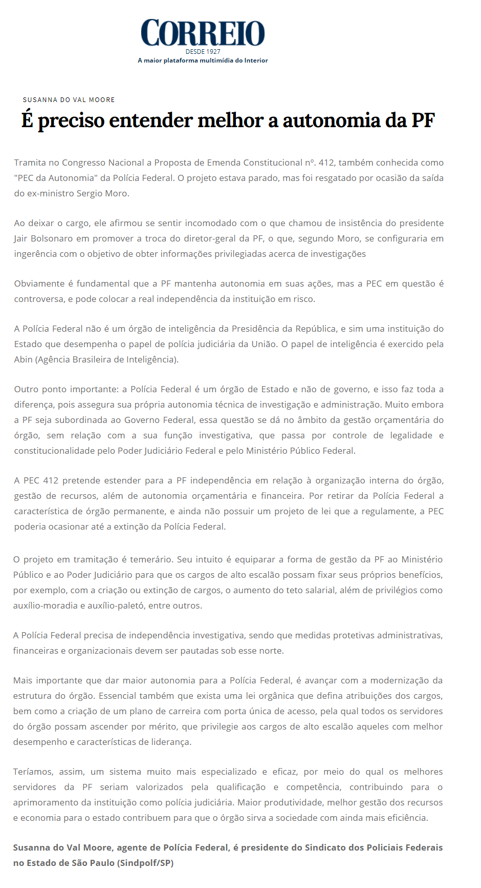 O artigo da presidente do SINPF-SP, Susanna do Val Moore, sobre a autonomia da PF, divulgado pela Folha de S. Paulo no dia 25/09, ganhou ampla repercussão na imprensa. O texto também foi publicado pelos jornais A Tribuna de Santos, Correio Popular e Gazeta do Povo.
