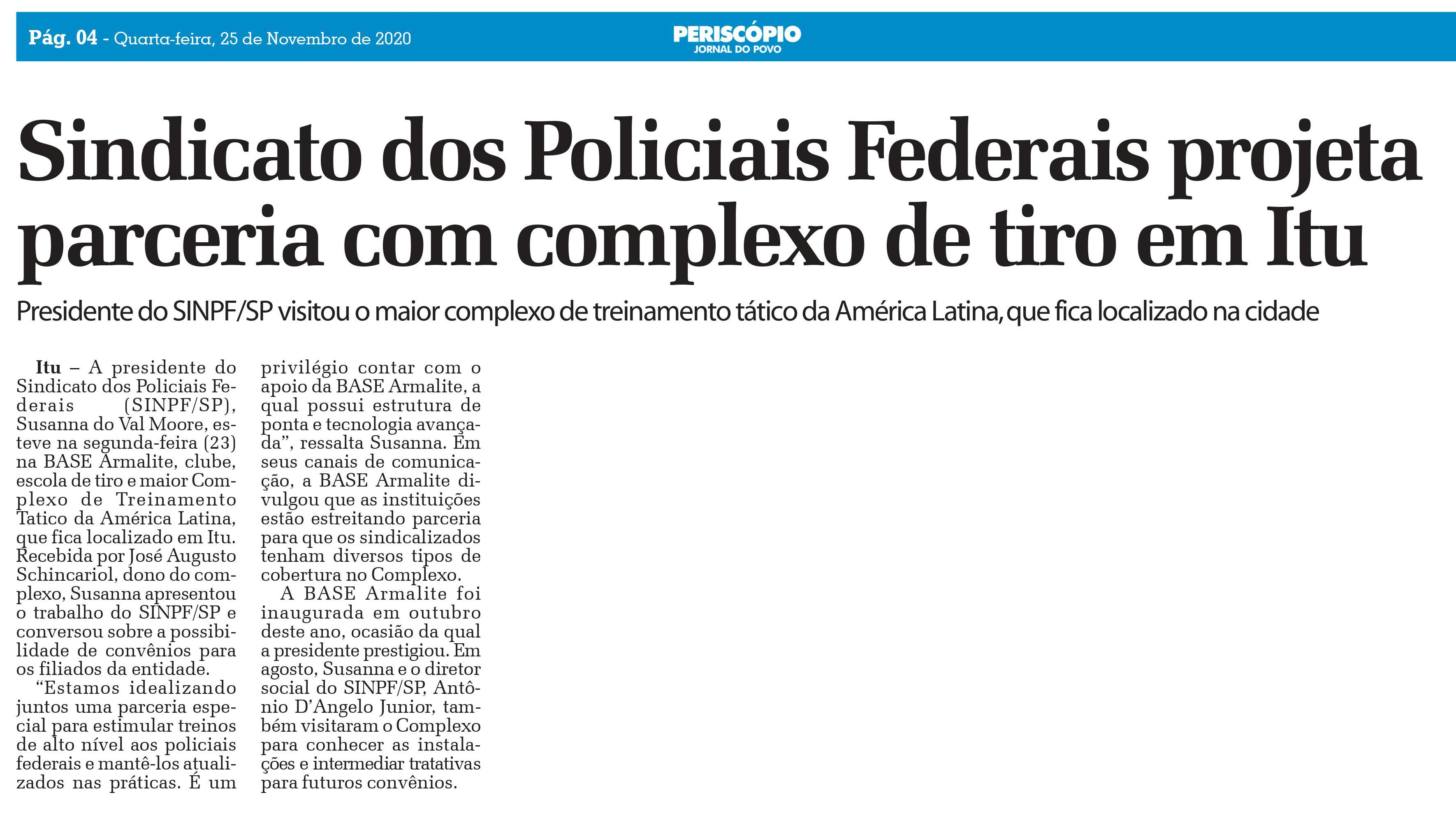 O Jornal Periscópio, de Itu (SP), destacou a visita da presidente do Sindicato dos Policiais Federais, Susanna do Val Moore, à Base Armalite, maior Complexo de Treinamento Tático da América Latina. Na ocasião, Susanna e José Augusto Schincariol, dono do complexo, estreitaram parceria e discutiram sobre a possibilidade de convênios para os filiados do SINPF/SP. “Estamos idealizando juntos uma parceria especial para estimular treinos de alto nível aos policiais federais e mantê-los atualizados nas práticas”, diz a presidente da entidade.
