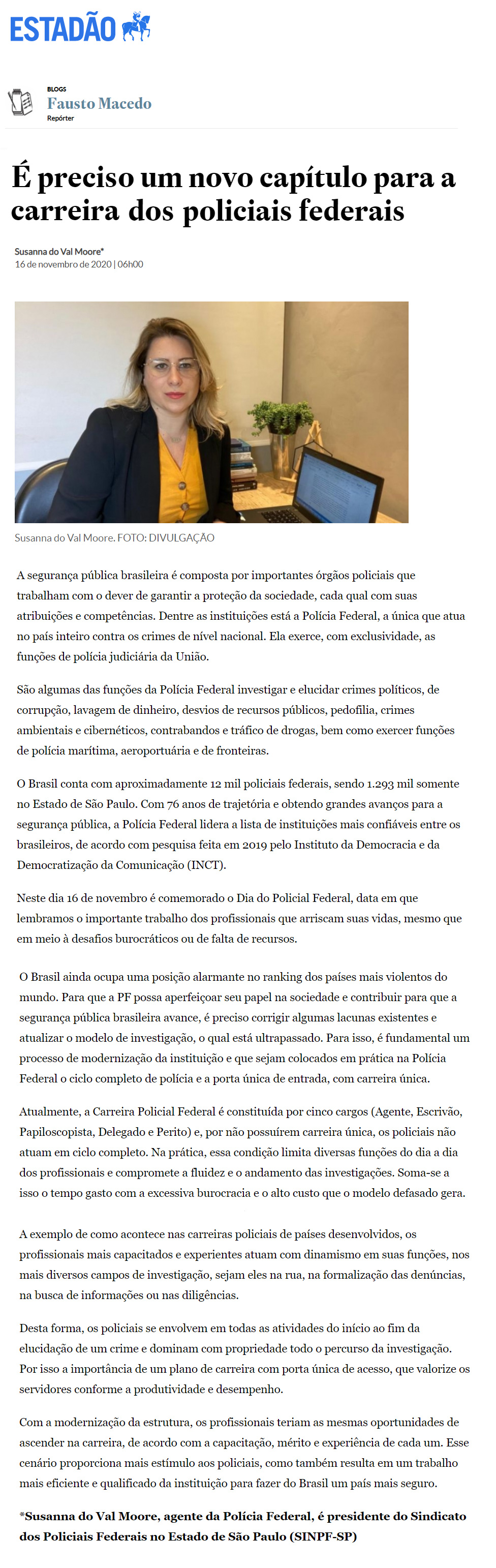 Em artigo publicado no Estadão nesta segunda-feira (16/11), Dia do Policial Federal, a presidente do SINPF/SP, Susanna do Val Moore, exalta a atuação dos policiais federais pela segurança pública e enfatiza a importância da modernização da Polícia Federal, que resultará em mais valorização aos servidores e eficiência ao trabalho prestado para a sociedade.